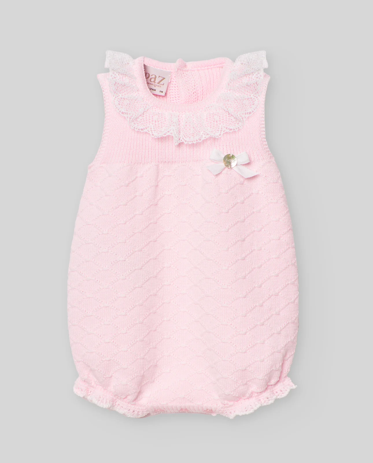 Pelele punto canesú tipo canalé y motivo geometrico con cuello en tejido acabado en puntilla.