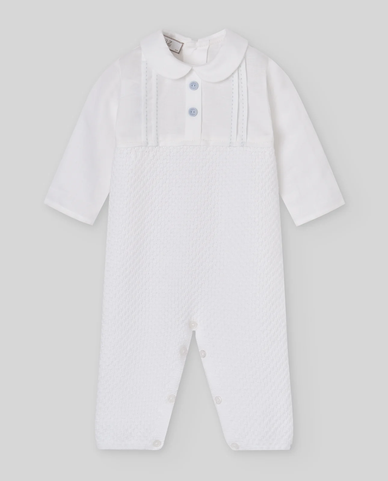 Pelele largo para bebé niño confeccionado en tejido combinado con punto y algodón. Su cuello redondo y detalles bordados aportan un estilo clásico y refinado.
