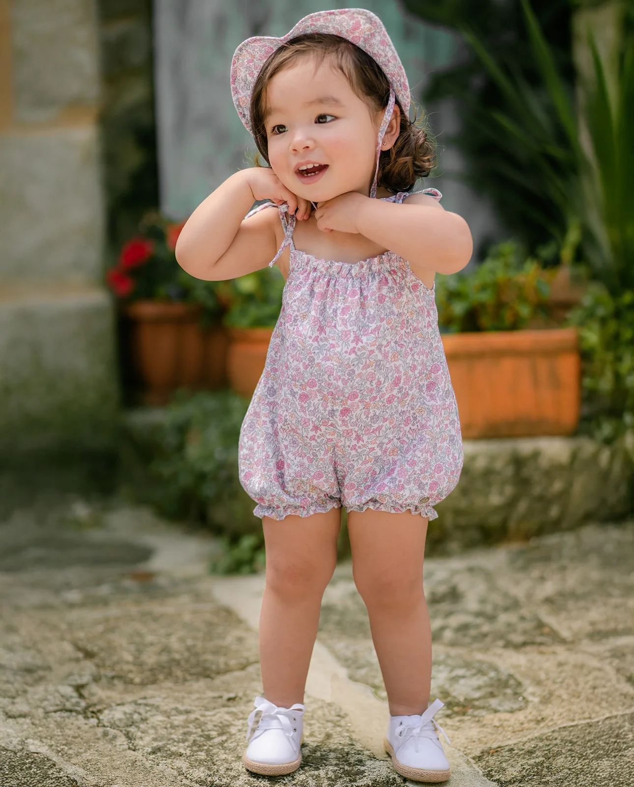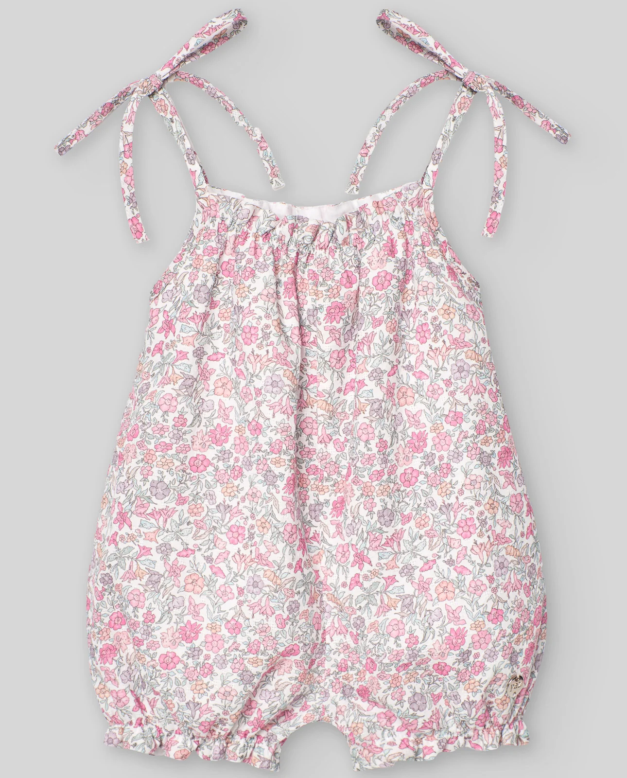 Pelele corto para bebé niña, estilo ranita, con delicados tirantes adornados con lazos. Presenta un encantador estampado floral estilo Liberty en suaves tonos rosados. Diseñado con elásticos en la parte superior y en las piernas para garantizar un ajuste perfecto y máximo confort.