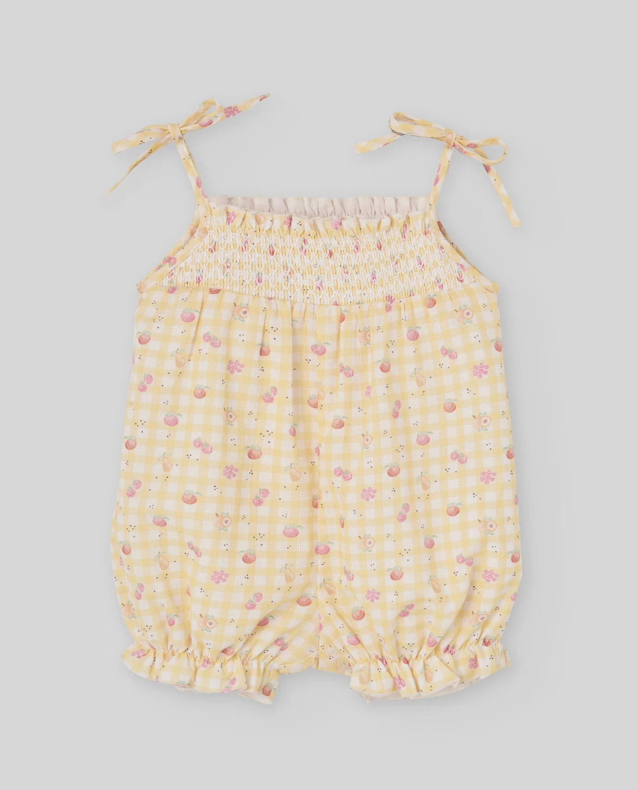 Pelele de tirantes para bebé niña con estampado vichy y nido de abeja en el pecho. Ligero y cómodo, es perfecto para los días más cálidos.