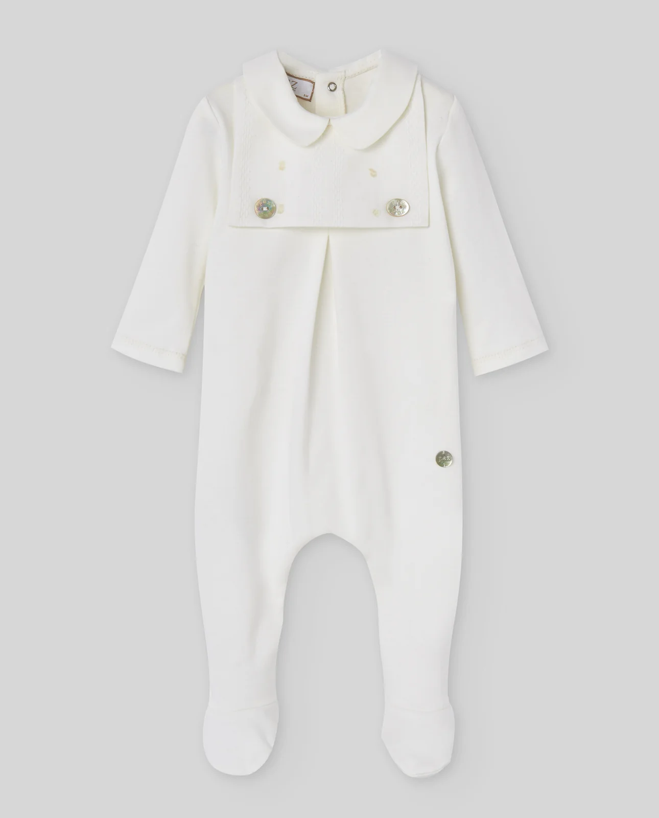 Pelele largo con pie y pechera para bebé niño, confeccionado en punto interlock suave. Su diseño tradicional lo hace perfecto para ceremonias o ocasiones especiales.