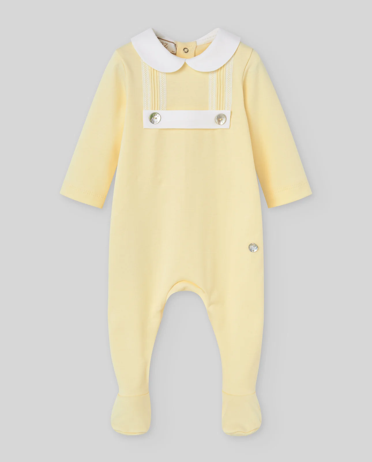 Pelele largo con pies y tira de botones delanteros para bebé niño. Su estructura cómoda y su delicado acabado lo convierten en una prenda perfecta para el día a día con un aire refinado.