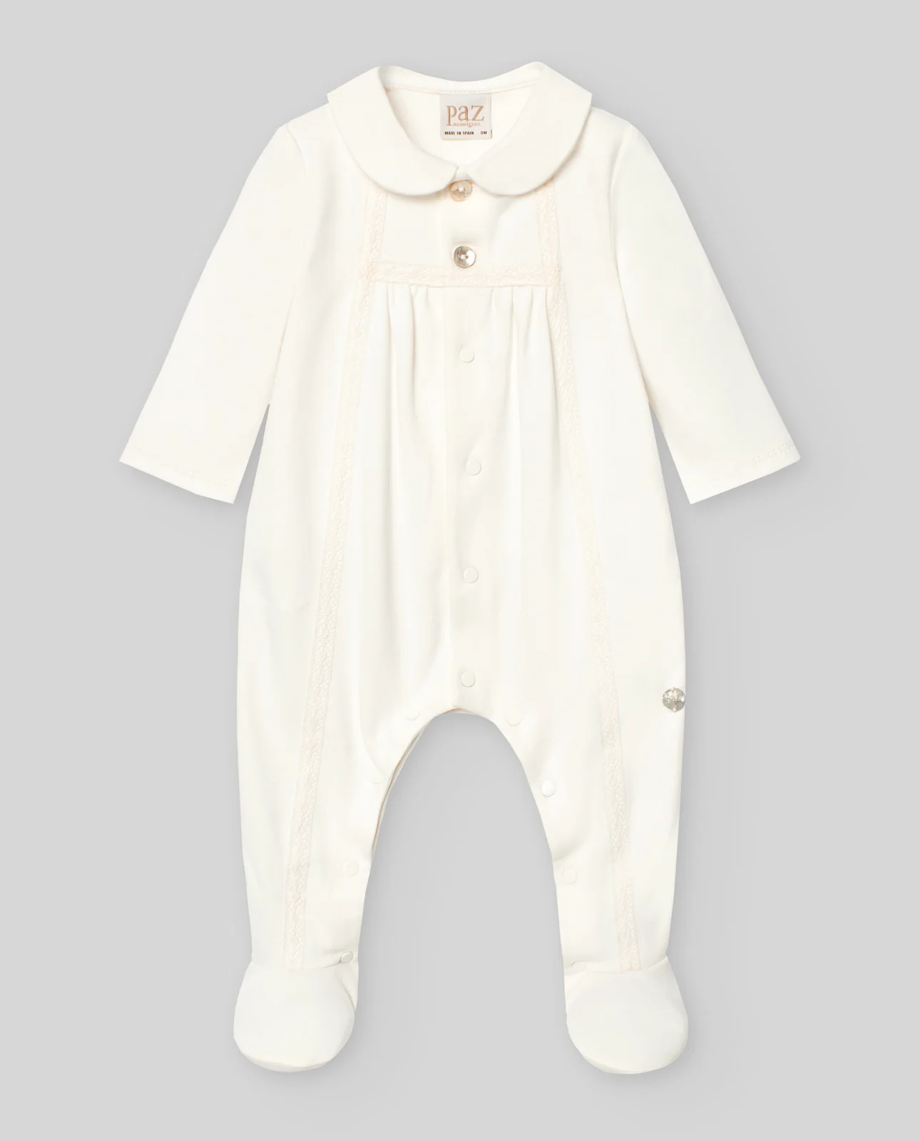 Pelele con pie y cuello redondo con puntillas a tono y frunce en centro delantero.