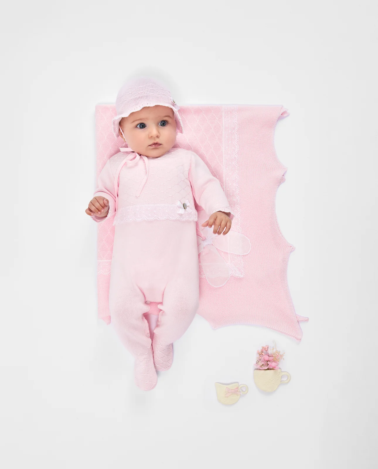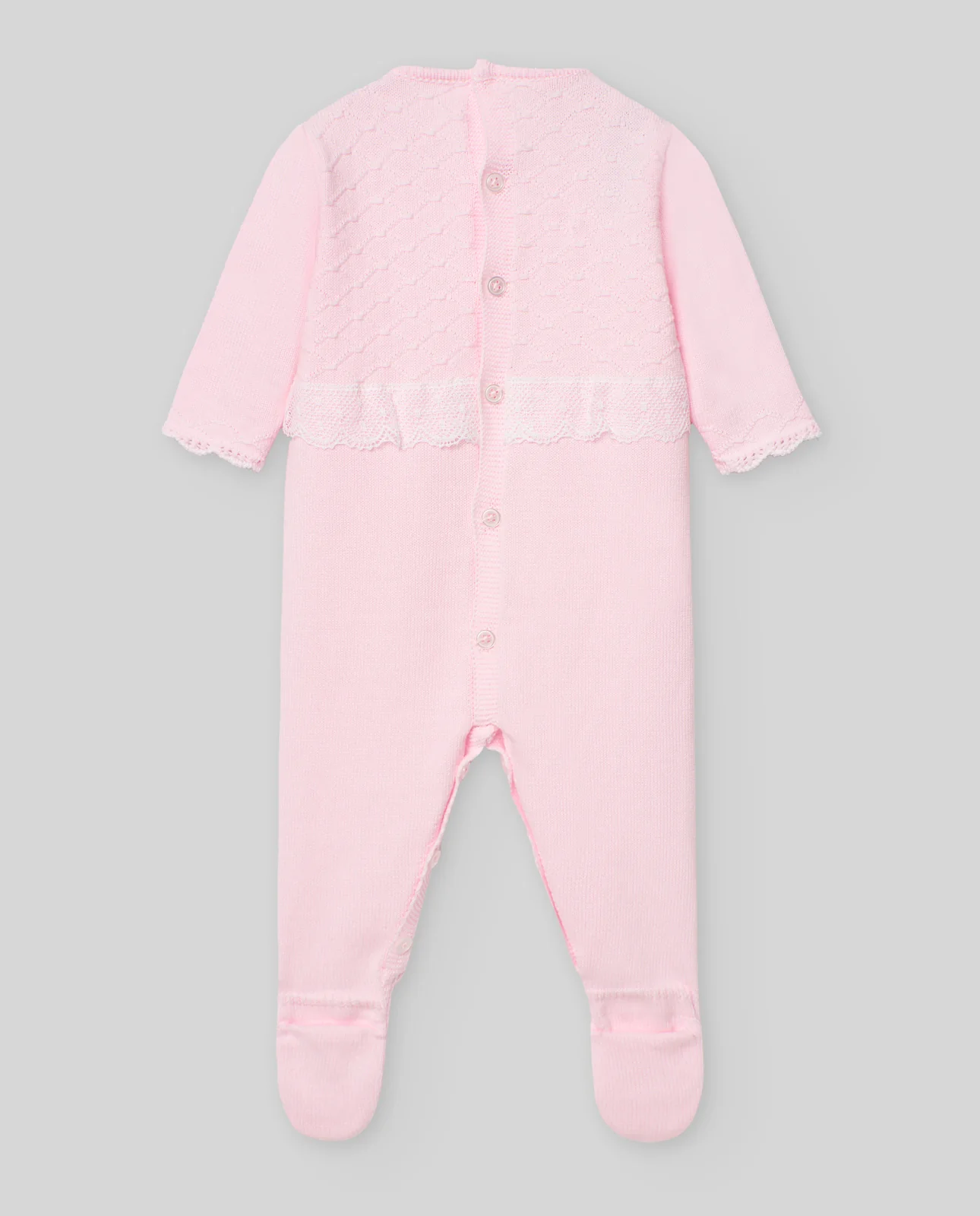 Pelele con pie y manga larga para bebé niña, confeccionado en suave punto con dibujo de rombos. Remate de onditas en las mangas. Cuello redondo y detalle de puntilla a contraste en la cintura. Cuenta con un cierre trasero de botones y una práctica abertura en la entrepierna con botones para facilitar el cambio de pañal.