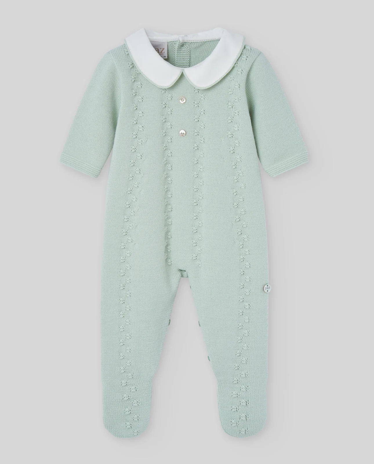 Pelele para niño con pies y cuello tejido, con diseño liso y detalles decorativos. Cierre trasero completo con broches a presión. Estilo clásico y cómodo para cualquier ocasión.