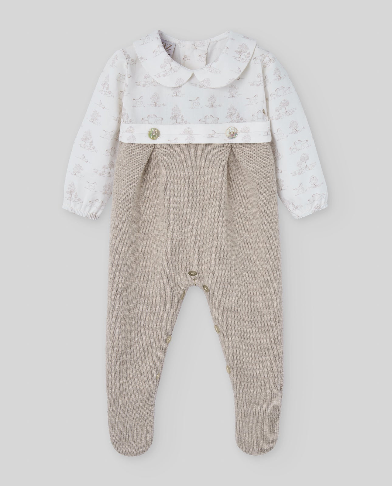 Pelele largo con tejido estampado combinado con algodón y cashmere. Cuello clásico con detalles decorativos. Cierre trasero con botones y entrepierna con corchetes.