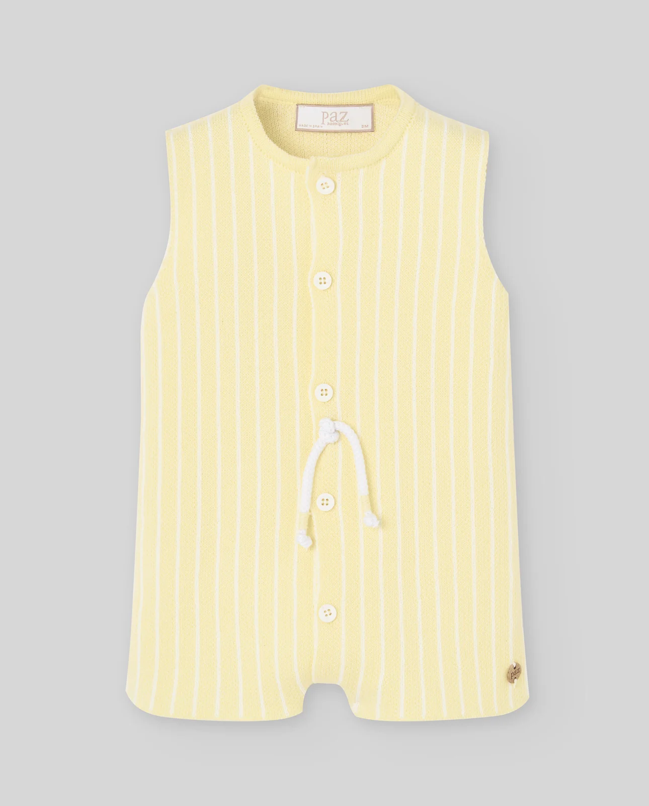 Pelele corto de punto para bebé niño con diseño de rayas verticales y cordón en la cintura. Una prenda ligera y moderna con inspiración náutica y acabado artesanal.