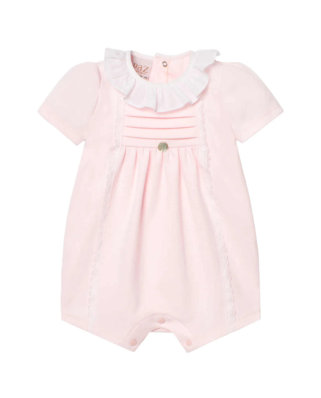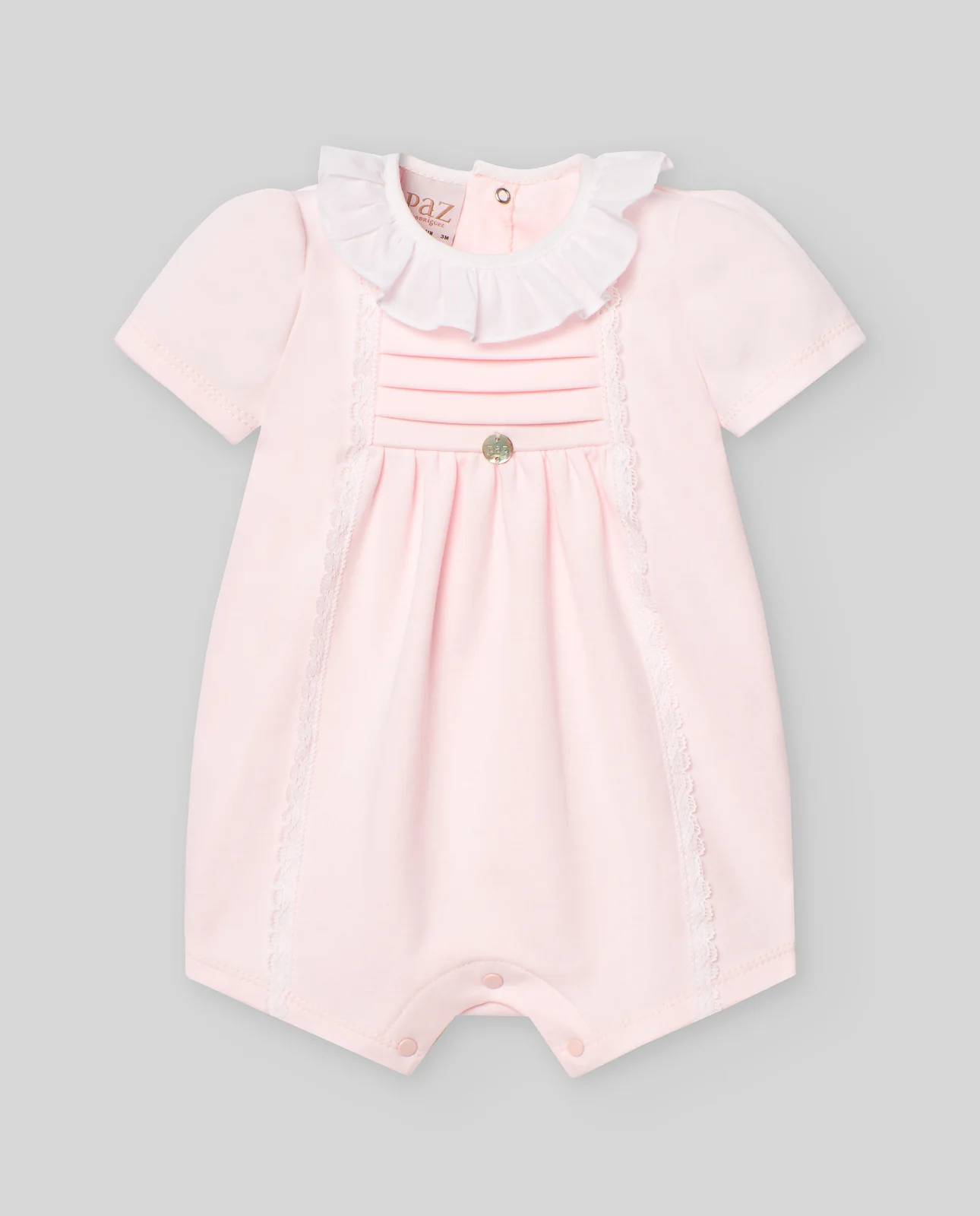 Pelele corto de manga corta con cuello en tela con forma de volante. Pechero tableado horizontalmente.