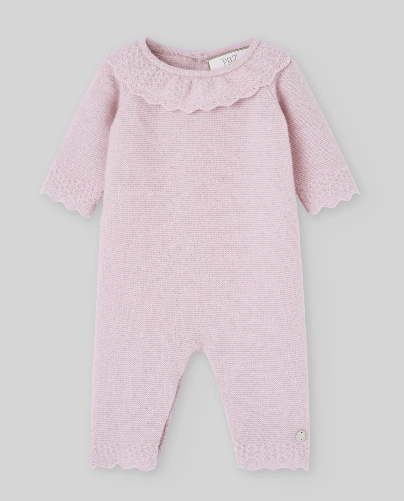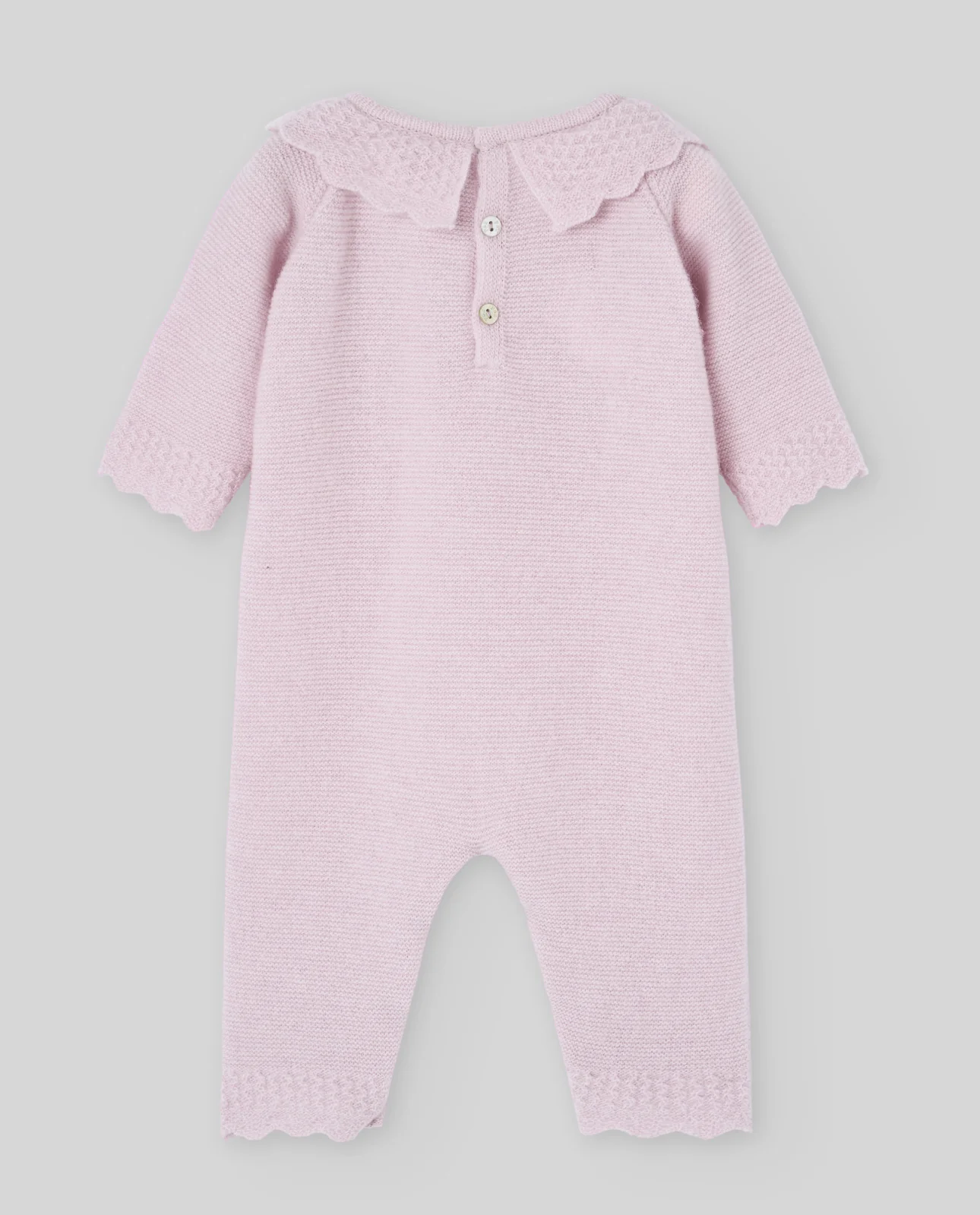Pelele largo sin pie para niña en punto liso de lana y cashmere. Diseño delicado con cuello decorativo y acabados festoneados, perfecto para las primeras puestas.
