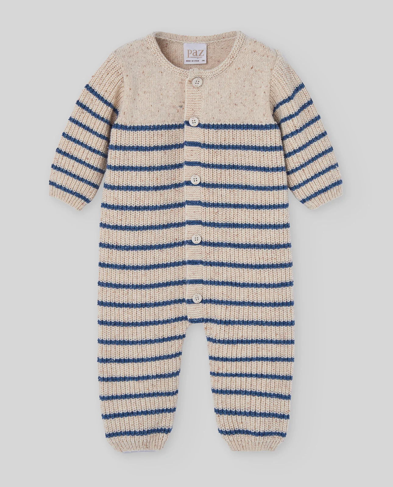 Pelele sin pies abierto por delante, con diseño a rayas. Cierre frontal con botones. Cómodo para el cambio rápido del bebé.