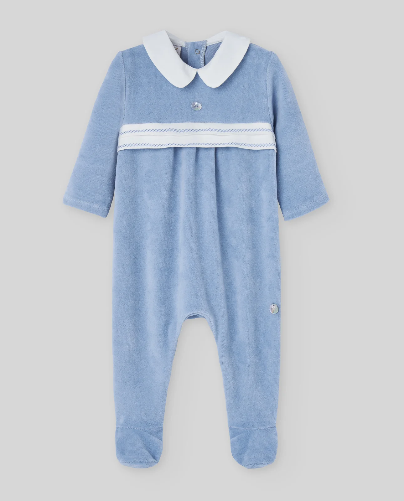 Pelele de tundosado con banda en el pecho como detalle principal. Cuello decorativo y cierre trasero con botones.