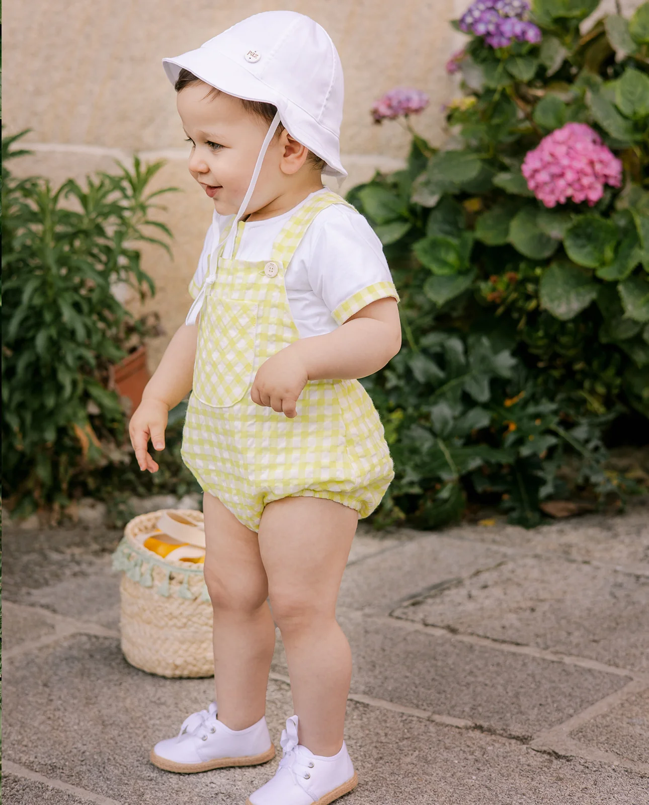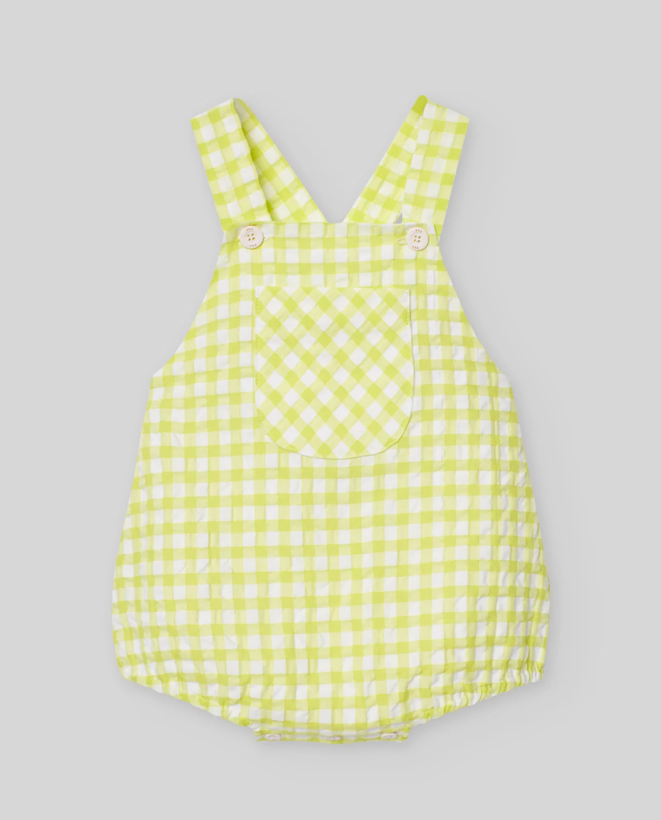 Peto corto para bebé niño en tejido seersucker. Tirantes ajustables con botón y elásticos en la pierna para mayor confort. Bolsillo tipo plastrón en el delantero. Botones en la entrepierna para facilitar el cambio de pañal.