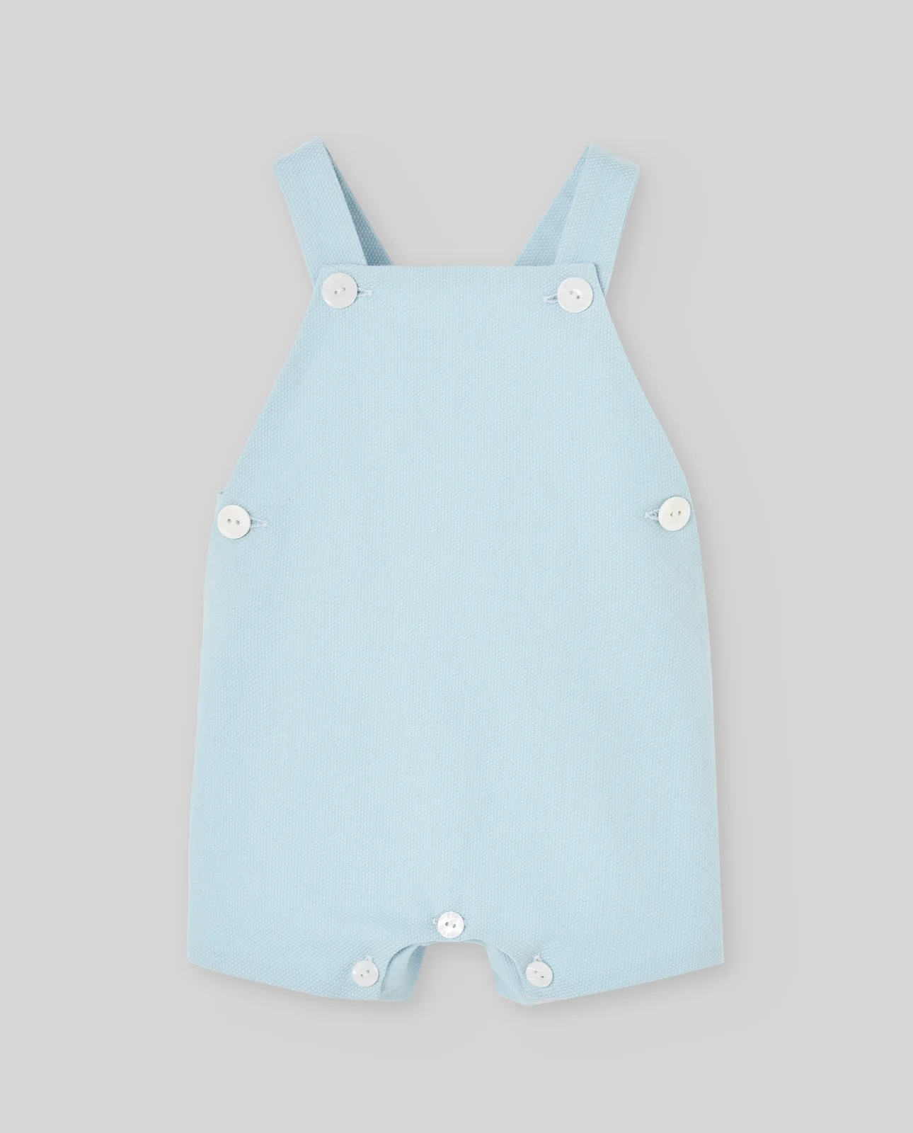 Peto corto de piqué para bebé niño con tirantes cruzados y botones laterales; tradicional y muy cómodo para el calor.
