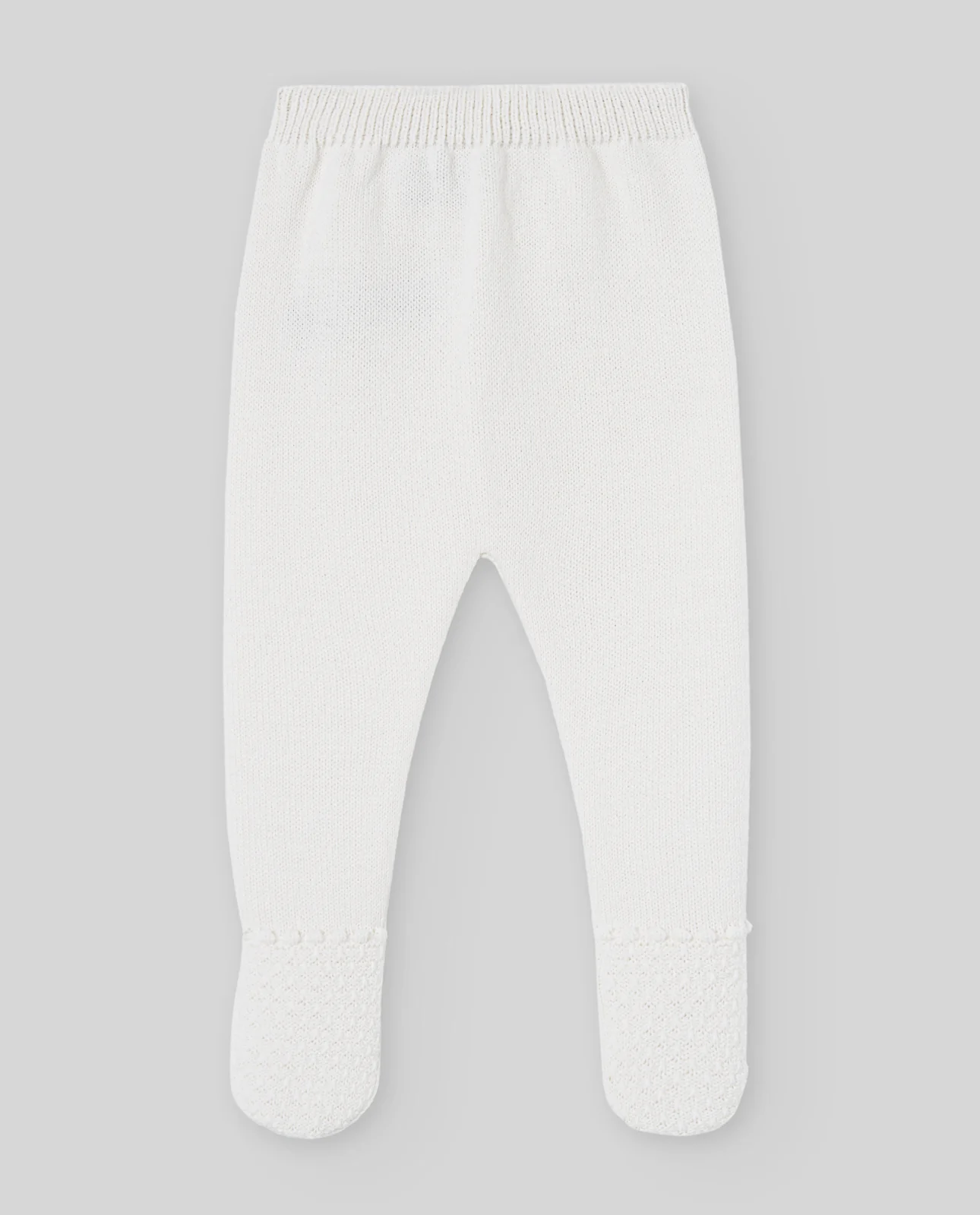 Polaina de punto liso combinada con el conjunto PAZ OI 25-26. Cintura elástica, ideal para mantener el confort del bebé en looks coordinados.