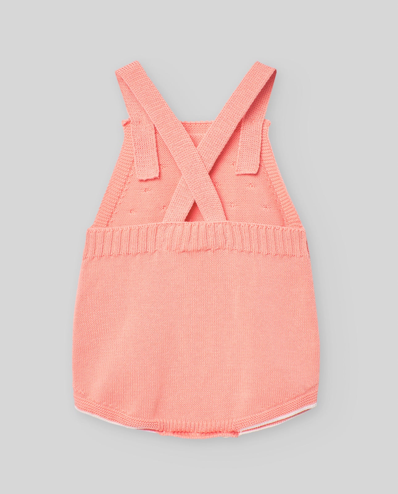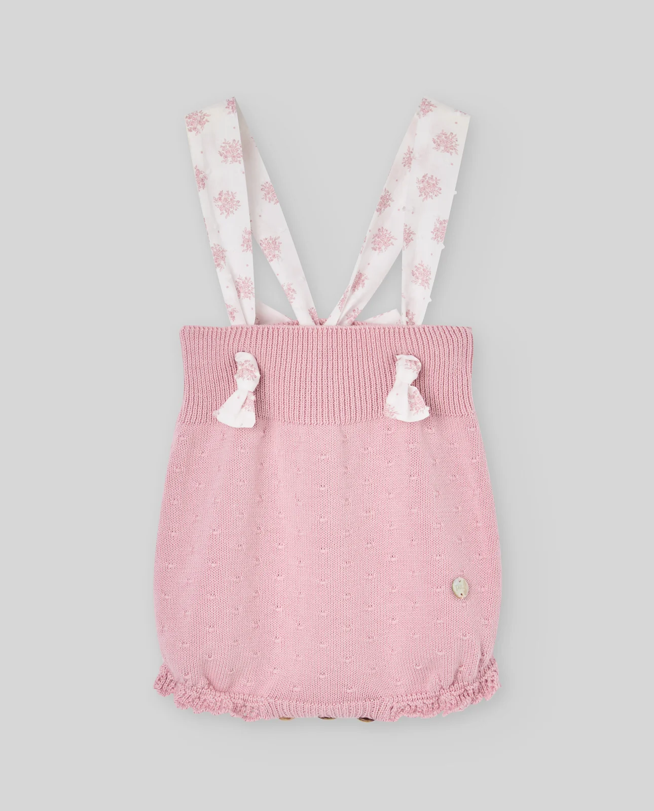 Ranita de punto con tirantes de tejido estampado y lazos decorativos, en color rosa con textura de topos, de la colección «Mimosa».