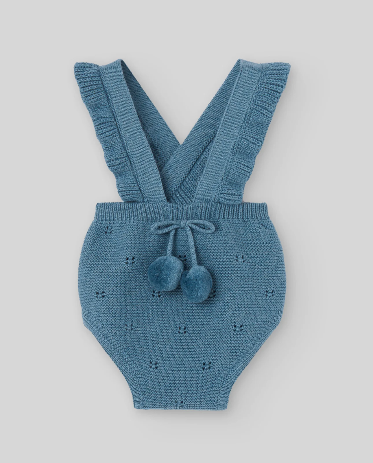 Ranita de punto con tirantes cruzados adornados con volantes y detalle de lazo con pompones en la cintura. Su diseño dulce y el acabado calado aportan un toque especial a los conjuntos del bebé.