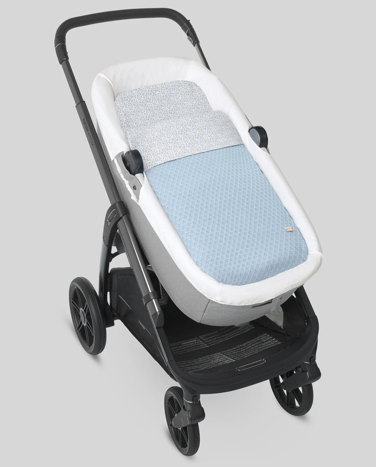 Saco para capazo de bebé confeccionado en punto relieve combinado con tejido espampado de FLORES. Relleno extraíble. Se adapta a casi todos los capazos del mercado.
