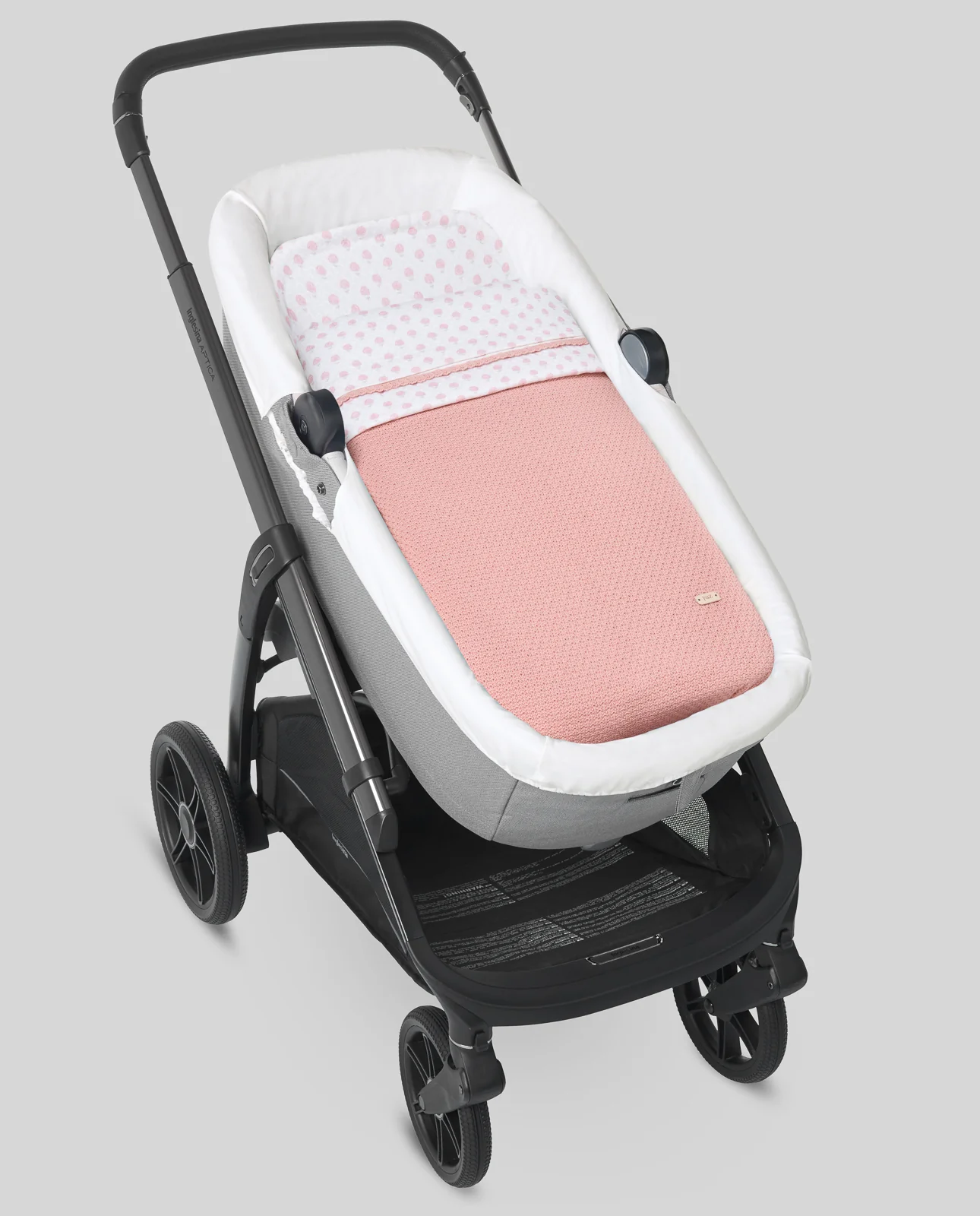 Saco para capazo de otomán cuadros con otomán estampado gansos en el interior. Embozo cuadrado y con botones en las esquinas como sujección. Relleno del cubrepiés extraible.