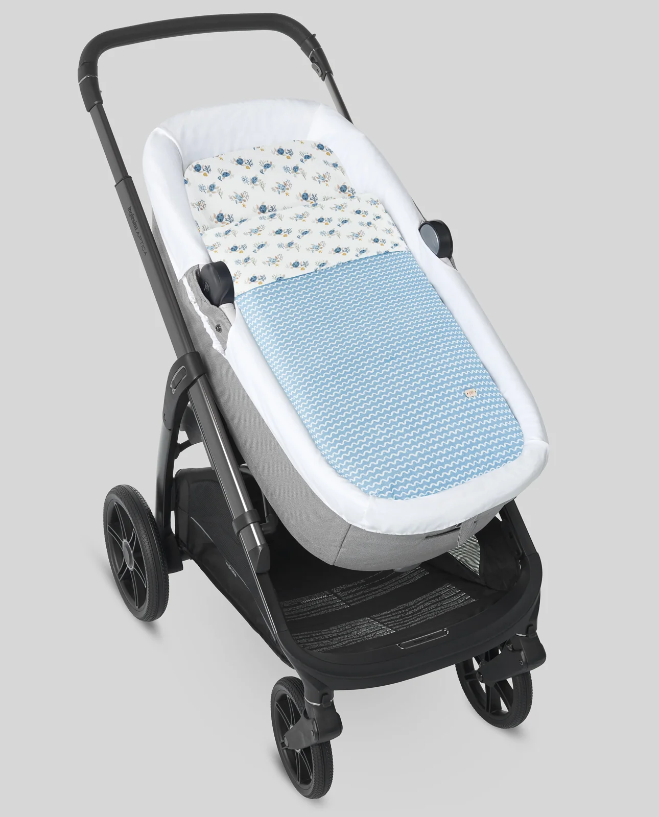 Saco para capazo de bambula olas con bambula de estampado tortugas en el interior. Embozo cuadrado y con botones en las esquinas como sujección. Relleno del cubrepiés extraible.