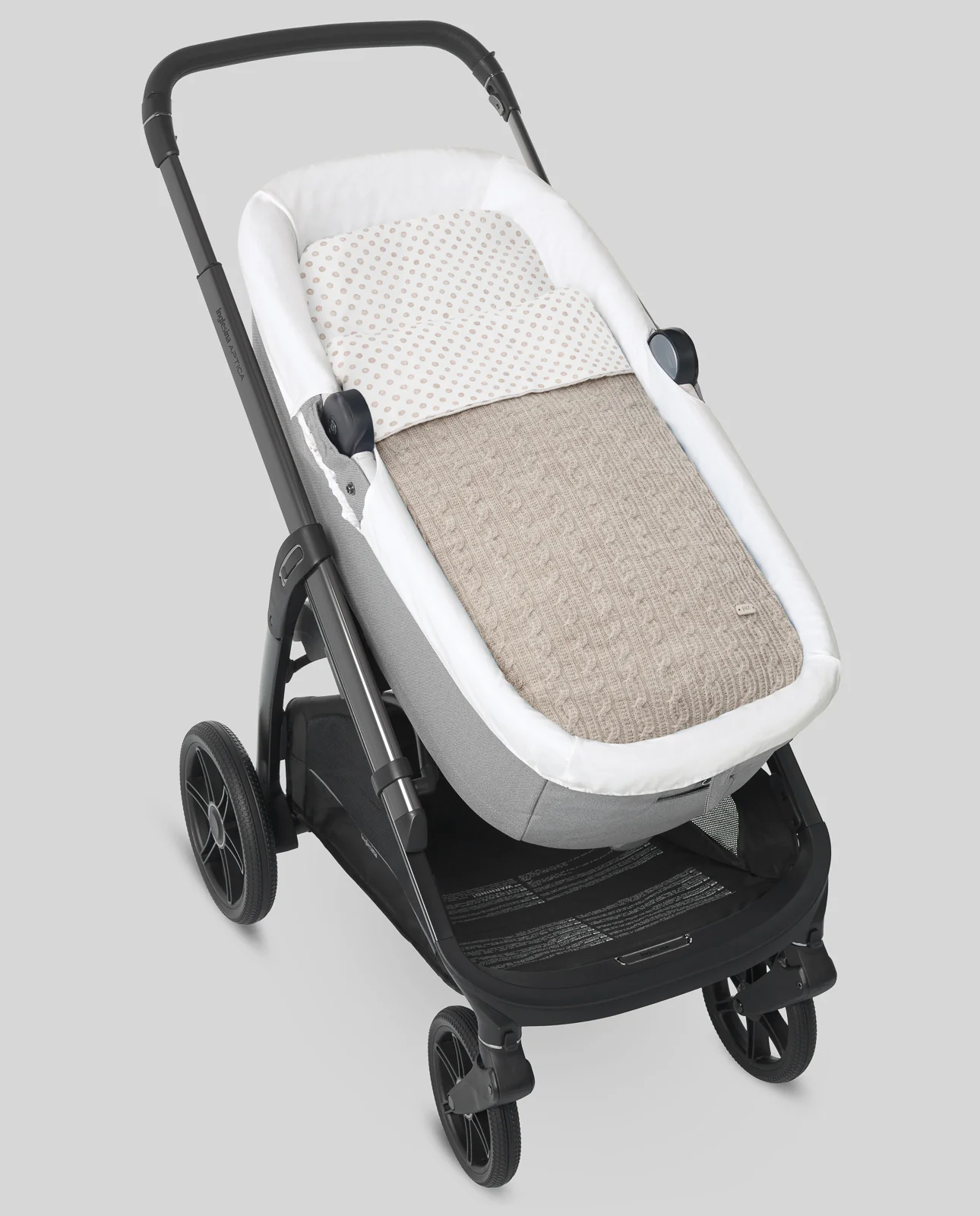 Saco para capazo de bebé confeccionado en punto ochos combinado con viella de lunares. Relleno extraíble. Se adapta a casi todos los capazos del mercado.