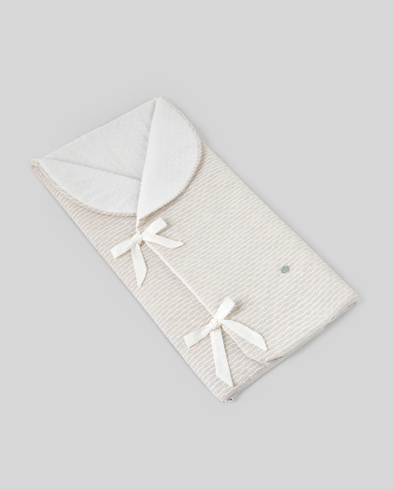 Saco nana de tejido bordado con interior de plumeti, con adorno puntilla y botones como cierre. Se abre totalmente para usar de cambiador. Tiene ojales traseros para porta bebé. Ideal para portar al bebé.