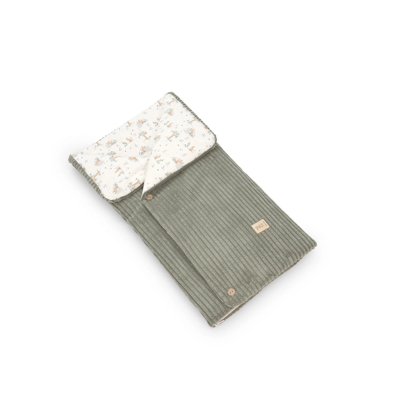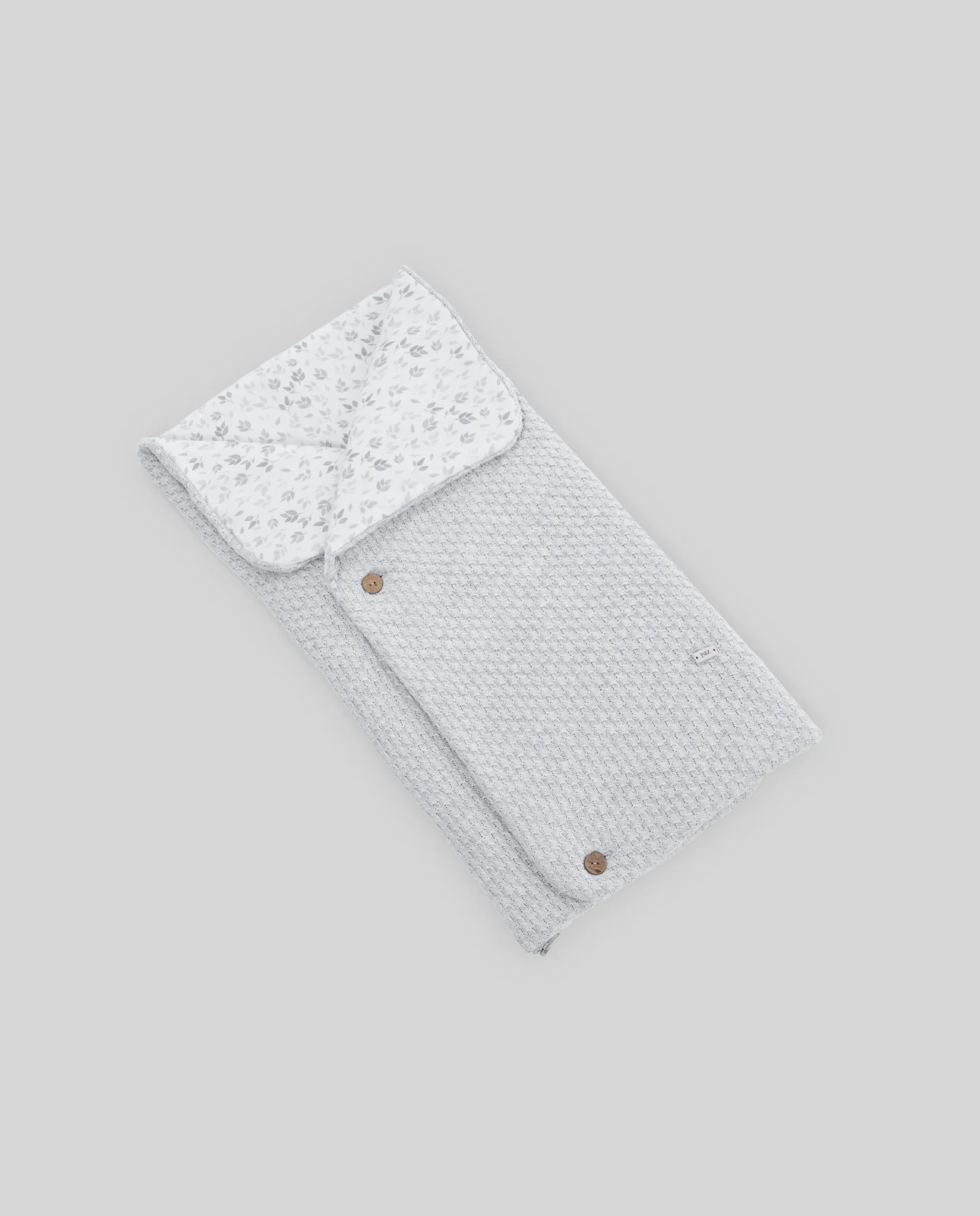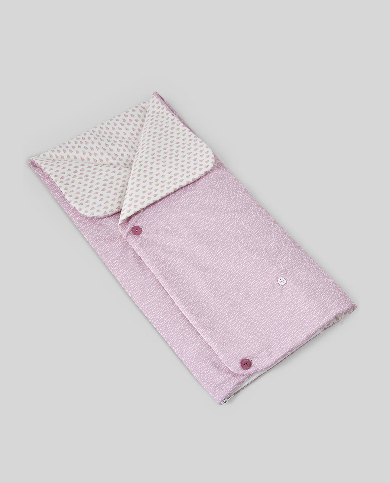 Saco nana de piqué con interior de piqué con hojas y exterior de otoman estampado topos. Se abre totalmente para usar de cambiador. Tiene ojales traseros para porta bebé. Ideal para portar al bebé.