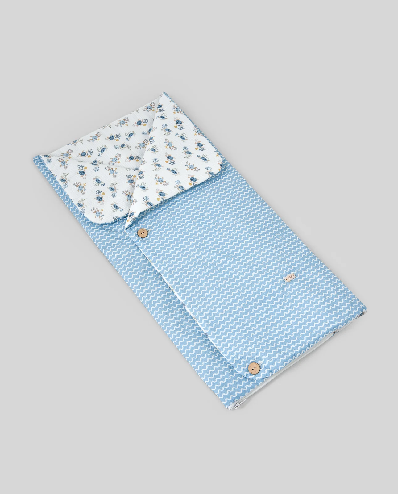 Saco nana de piqué con interior de bambula contortugas y exterior de bambula estampado olas. Se abre totalmente para usar de cambiador. Tiene ojales traseros para porta bebé. Ideal para portar al bebé.