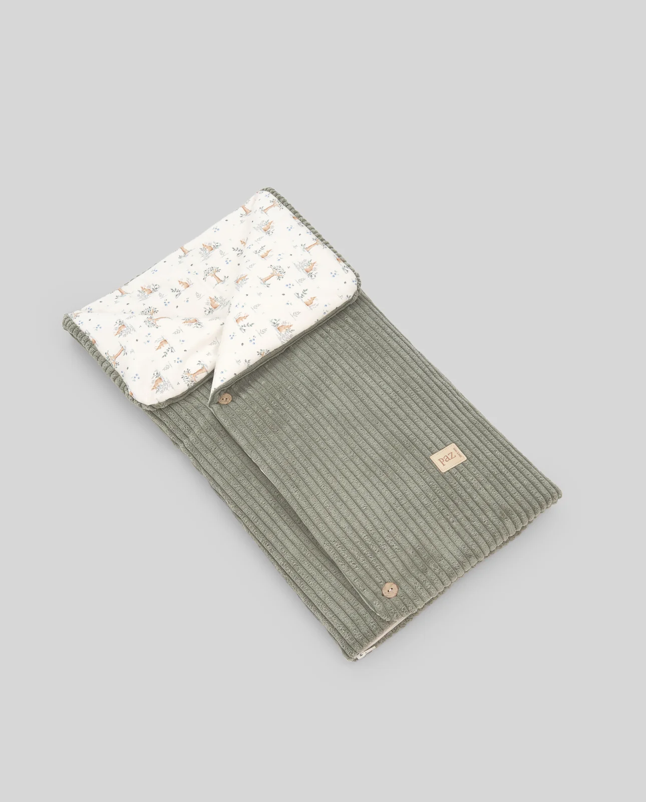 Saco nana con tejido pana ancha exterior y estampado de conejos interior y cierre con botones. Se abre totalmente para usar de cambiador. Tiene ojales traseros para portabebé. Ideal para portar al bebé.