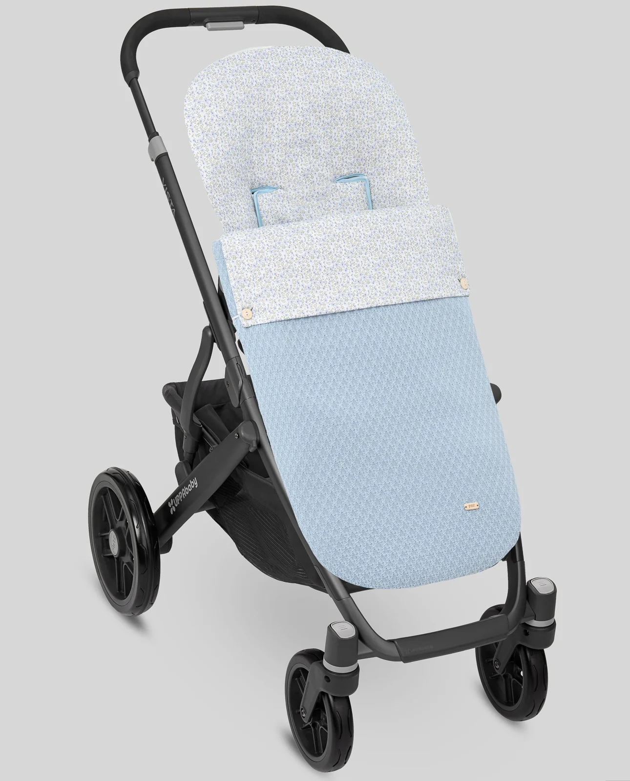 Saco para sillas estrechas de bebé confeccionado en punto y combinado con tejido estampado flores. Cremalleras laterales para convertir el saco en colchoneta. Relleno extraíble.