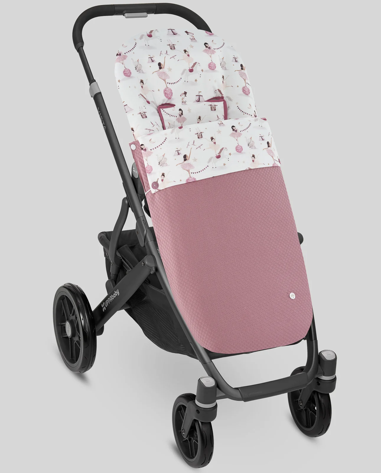 Saco para sillas ligeras o de formato estrecho confeccionado en piqué relieve combinado con popelin estampado de bailarinas en el interior. Cremalleras laterales para convertir el saco en colchoneta. Refuerzo de polipiel en los pies. Relleno del cubrepiés extraible.