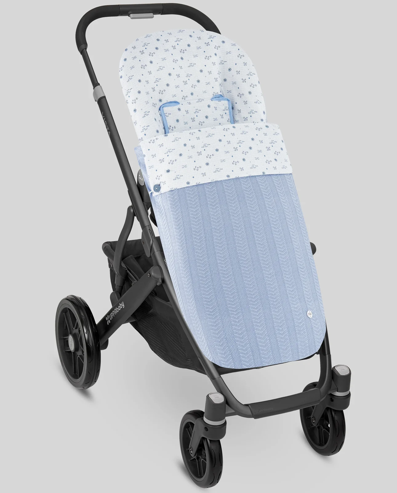 Saco para sillas ligeras o de formato estrecho en punto de algodón combinado con tejidobambula estampado peces. Embozo cuadrado con botones para sujetar. Cremalleras laterales para convertir el saco en colchoneta. Refuerzo de polipiel en los pies. Relleno del cubrepiés extraible.