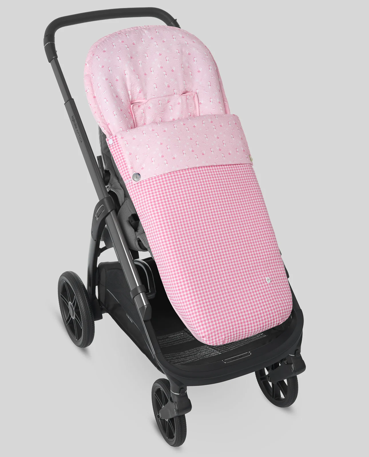 Saco para sillas de paseo confeccionado en bambula de vichy combinada con bambula de estampado marino en el interior. Cremalleras laterales para convertir el saco en colchoneta. Refuerzo de polipiel en los pies. Relleno del cubrepiés extraible.