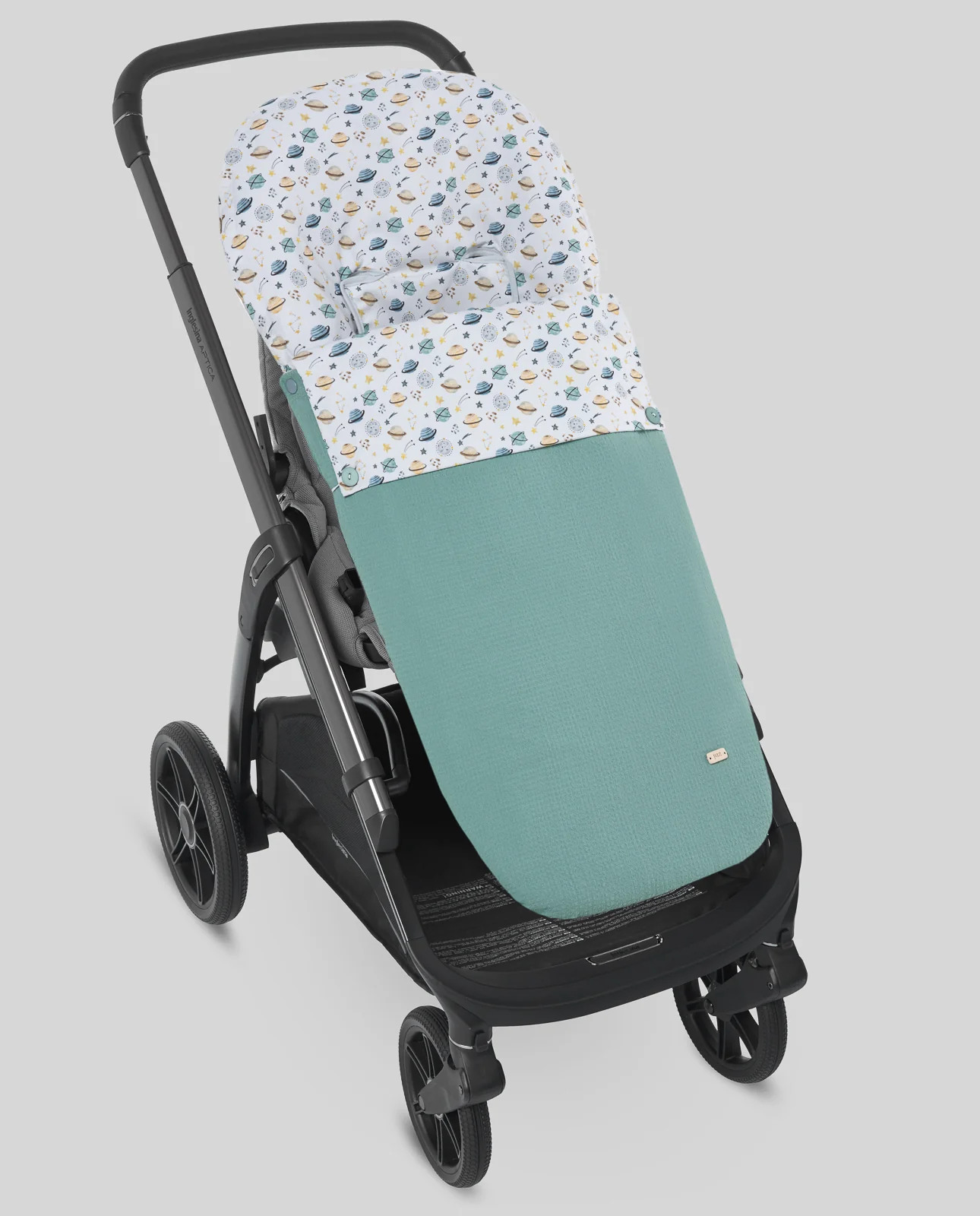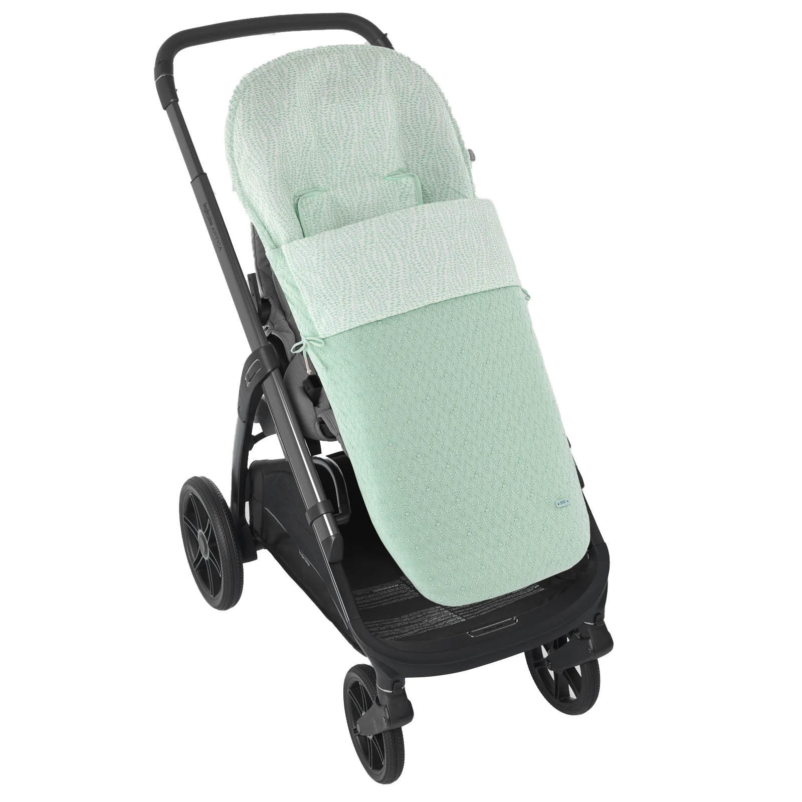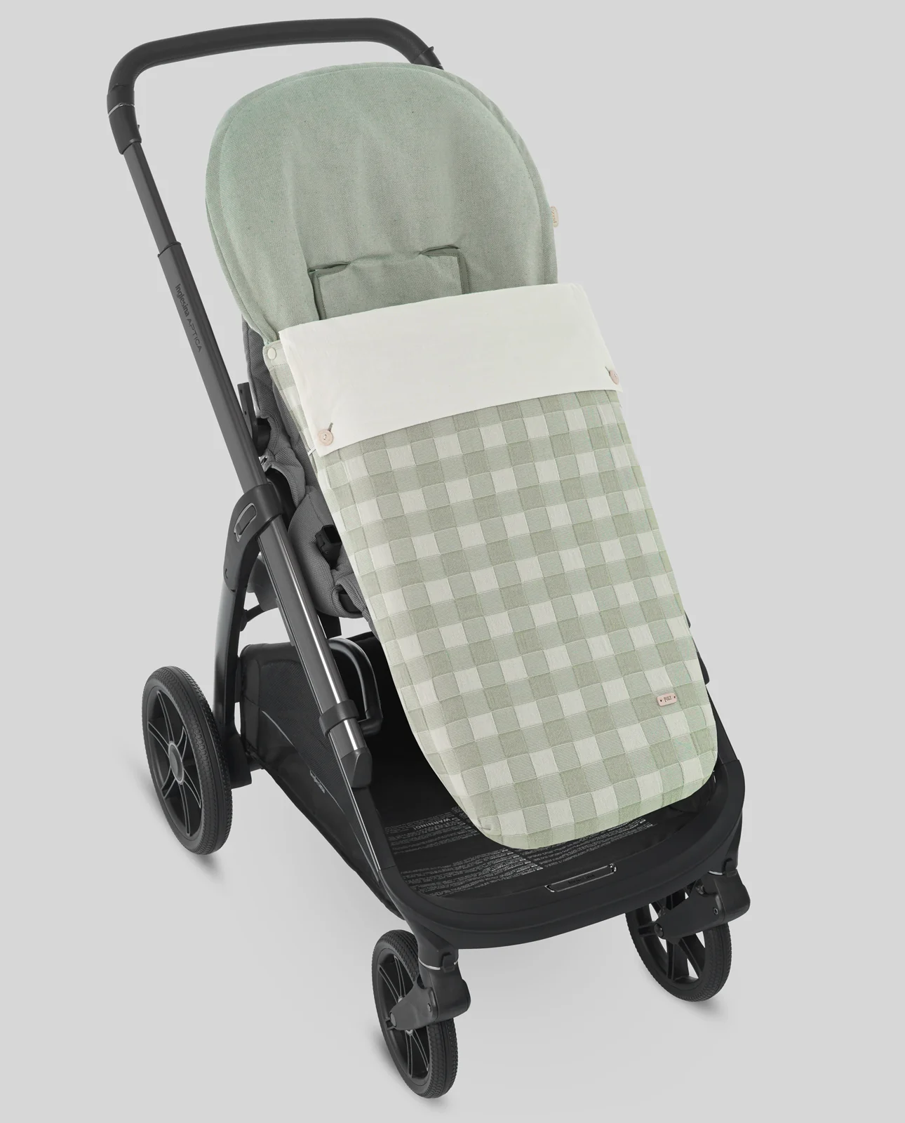 Saco para sillas de paseo confeccionado en tejido jersey-jacquard de cuadros combinado con loneta lisa en el interior y embozo crudo . Cremalleras laterales para convertir el saco en colchoneta. Refuerzo de polipiel en los pies. Relleno del cubrepiés extraible.