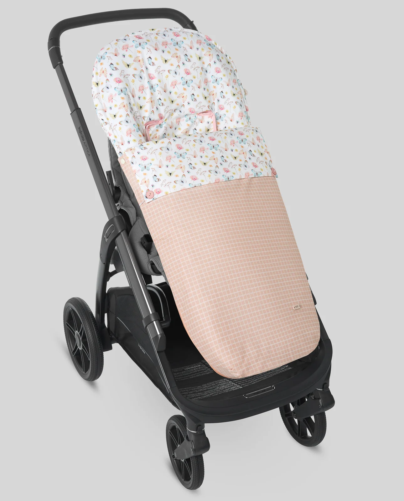 Saco para sillas de paseo confeccionado en popelún cuadros combinado con popelín de estampado mariposas en el interior. Cremalleras laterales para convertir el saco en colchoneta. Refuerzo de polipiel en los pies. Relleno del cubrepiés extraible.
