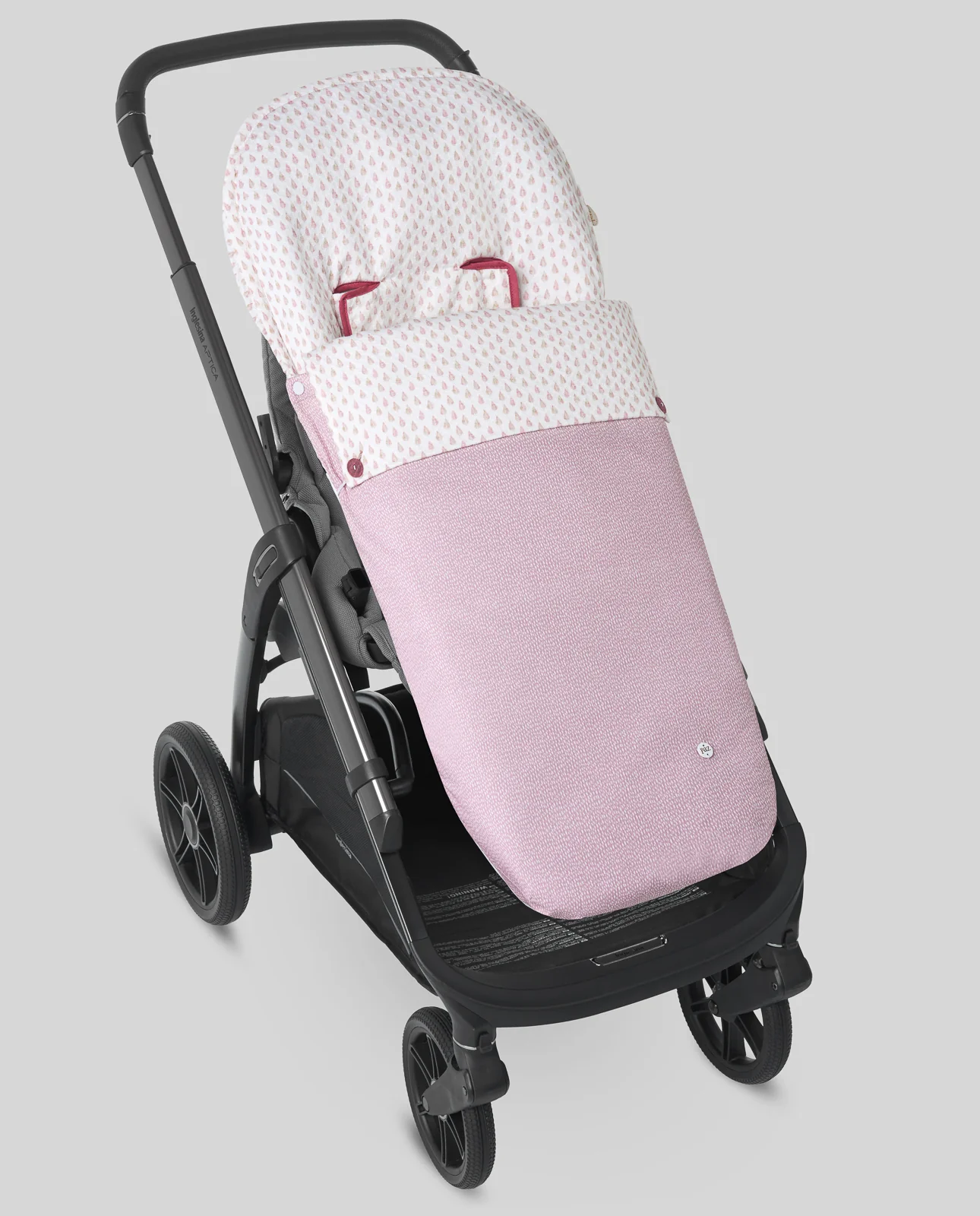 Saco para sillas de paseo confeccionado en otoman de topos combinado con pique estampado hojas en el interior. Cremalleras laterales para convertir el saco en colchoneta. Refuerzo de polipiel en los pies. Relleno del cubrepiés extraible.