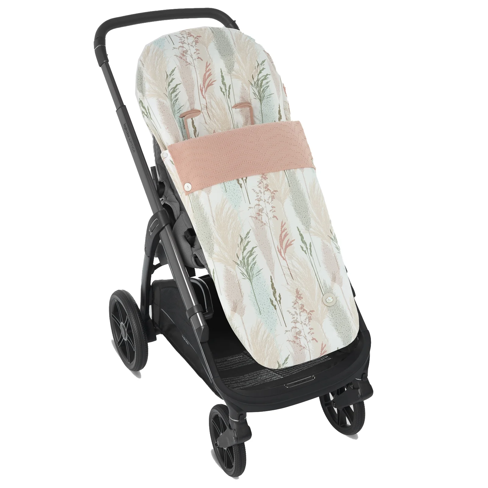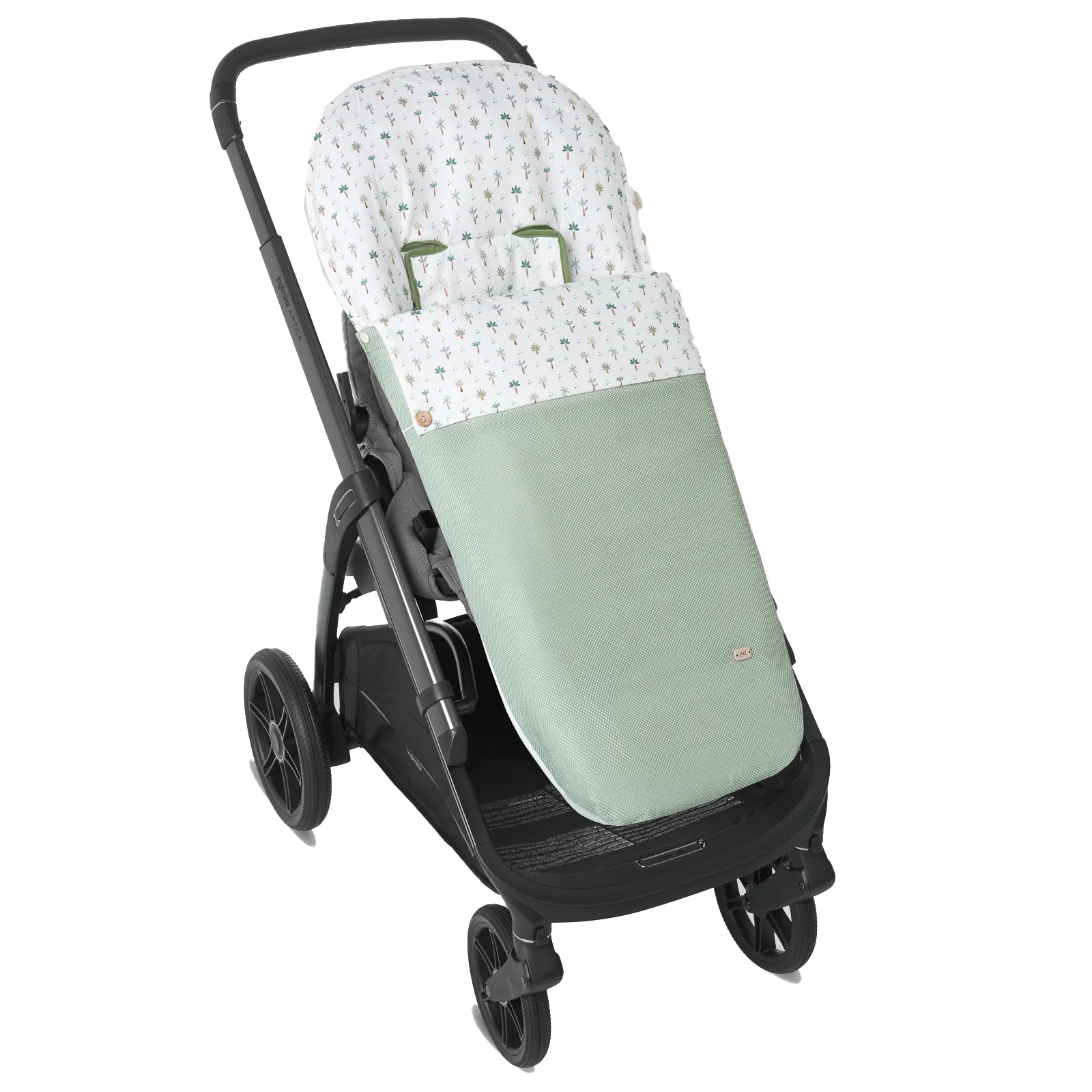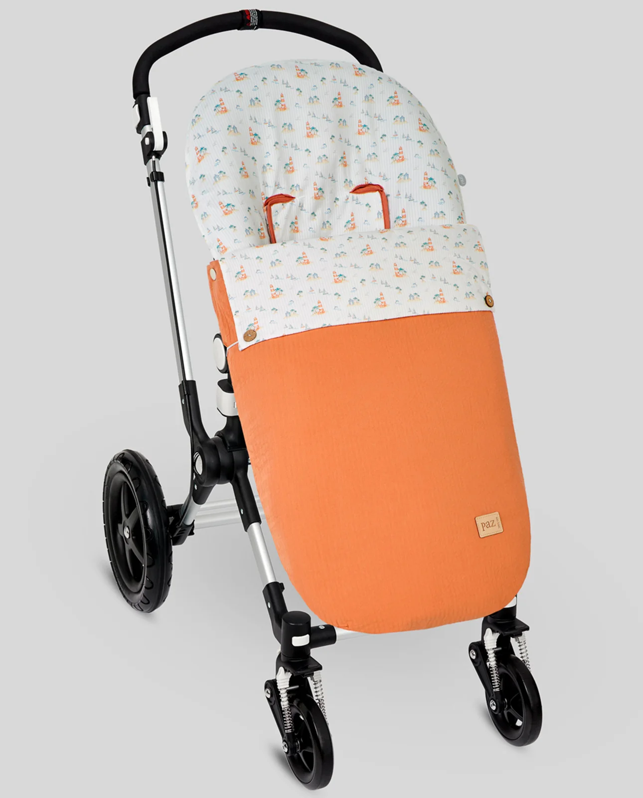 Saco para sillas de paseo confeccionado en seersuker de algodón combinada con seersuker estampado faros en el interior. Cremalleras laterales para convertir el saco en colchoneta. Refuerzo de polipiel en los pies. Relleno del cubrepiés extraible.
