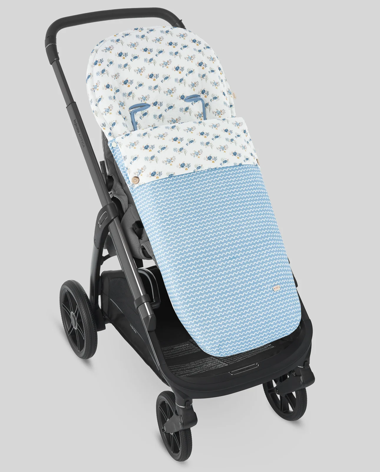 Saco para sillas de paseo confeccionado en bambula de olas combinada con bambula de estampado tortugas en el interior. Cremalleras laterales para convertir el saco en colchoneta. Refuerzo de polipiel en los pies. Relleno del cubrepiés extraible.