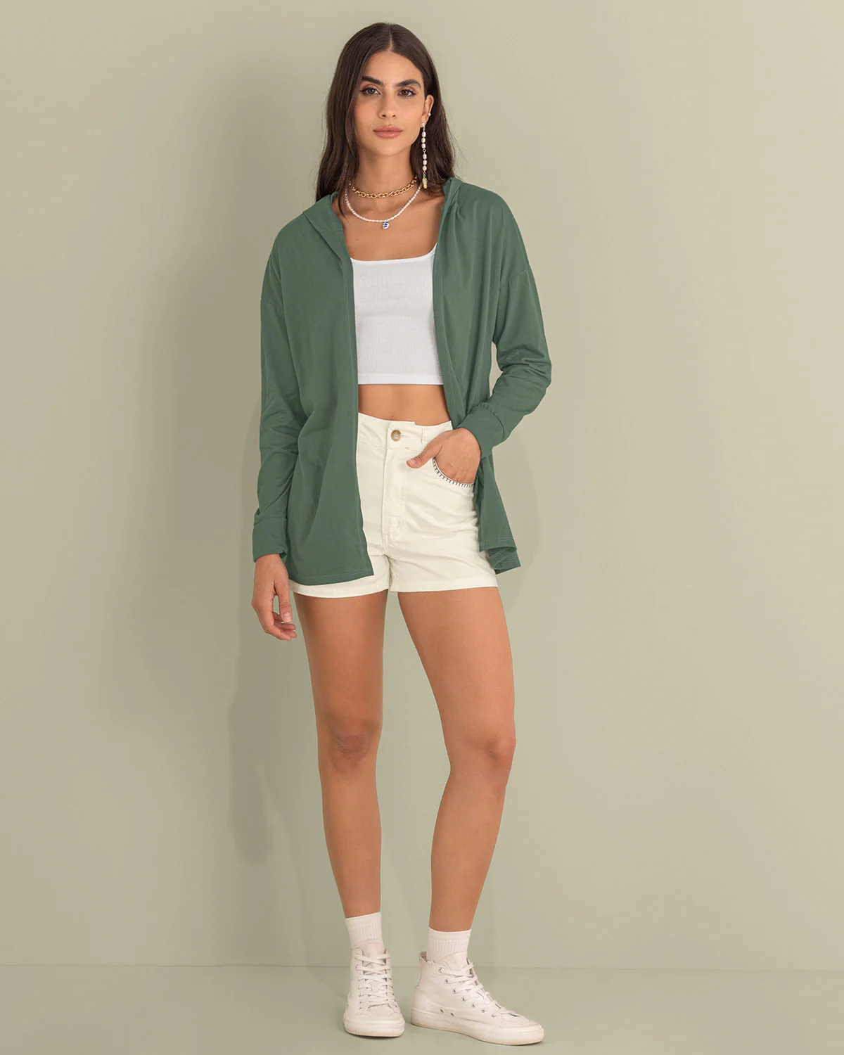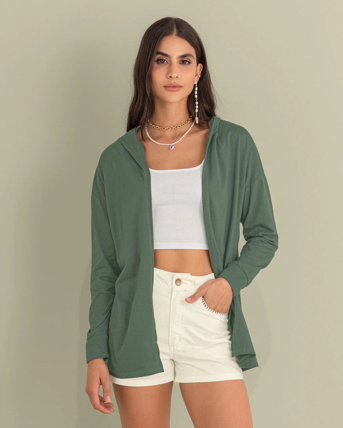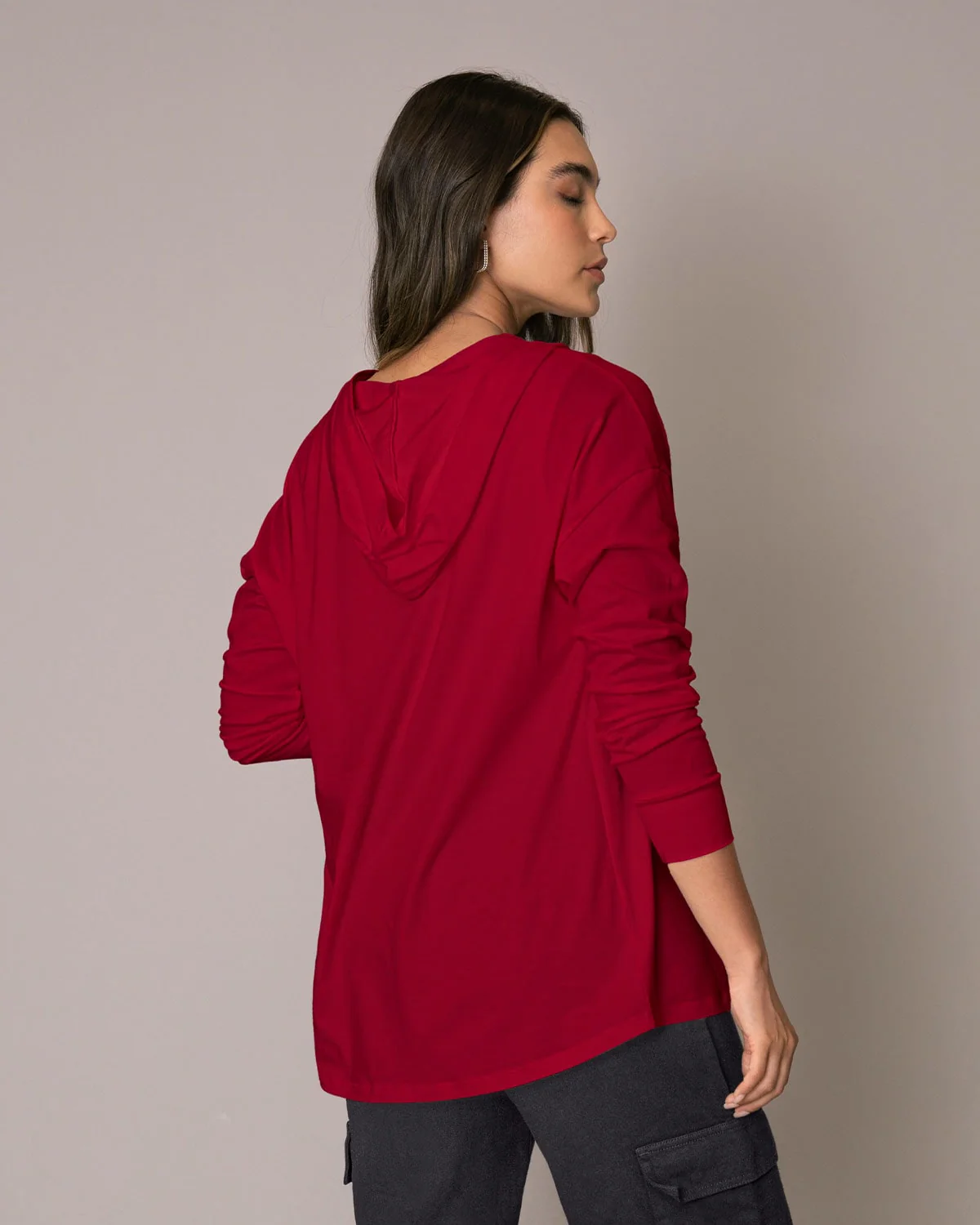 Este saquillo largo con capucha y puños en la misma tela, presenta un look relajado y esencial, perfecto para un outfit casual y descomplicado de domingo en la tarde. ¡Úsalo con unos joggers para darle un estilo loungewear a tus looks!