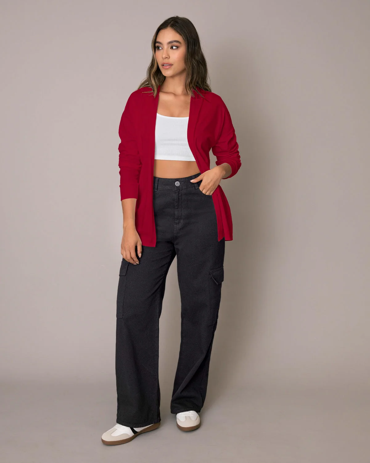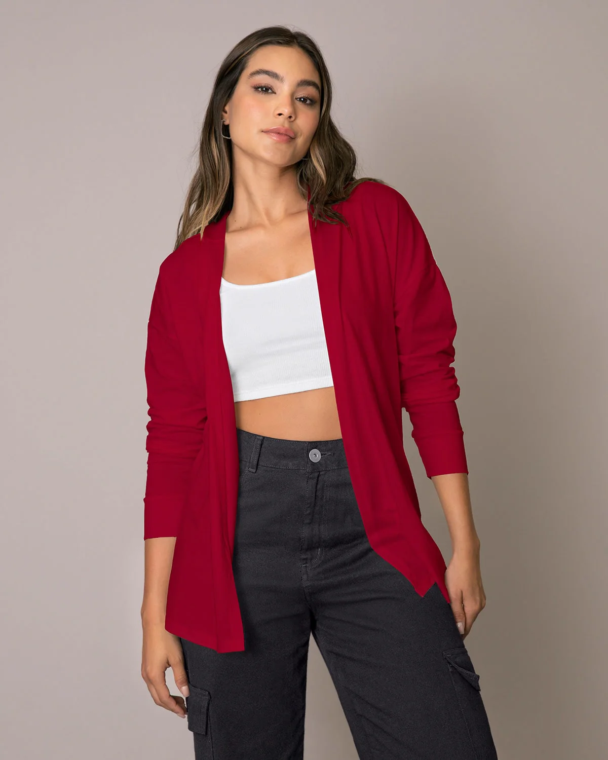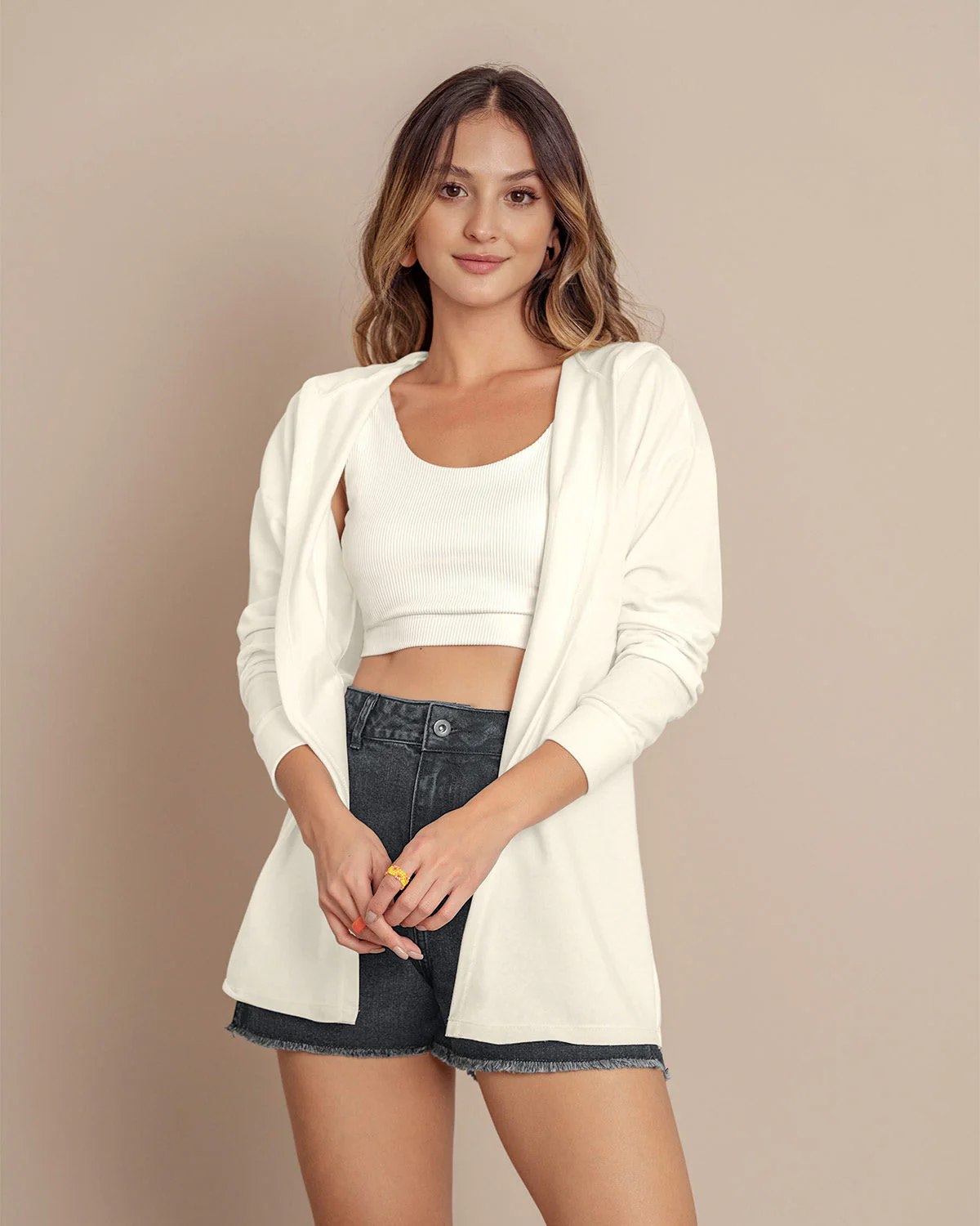 Este saquillo largo con capucha y puños en la misma tela, presenta un look relajado y esencial, perfecto para un outfit casual y descomplicado de domingo en la tarde. ¡Úsalo con unos joggers para darle un estilo loungewear a tus looks!