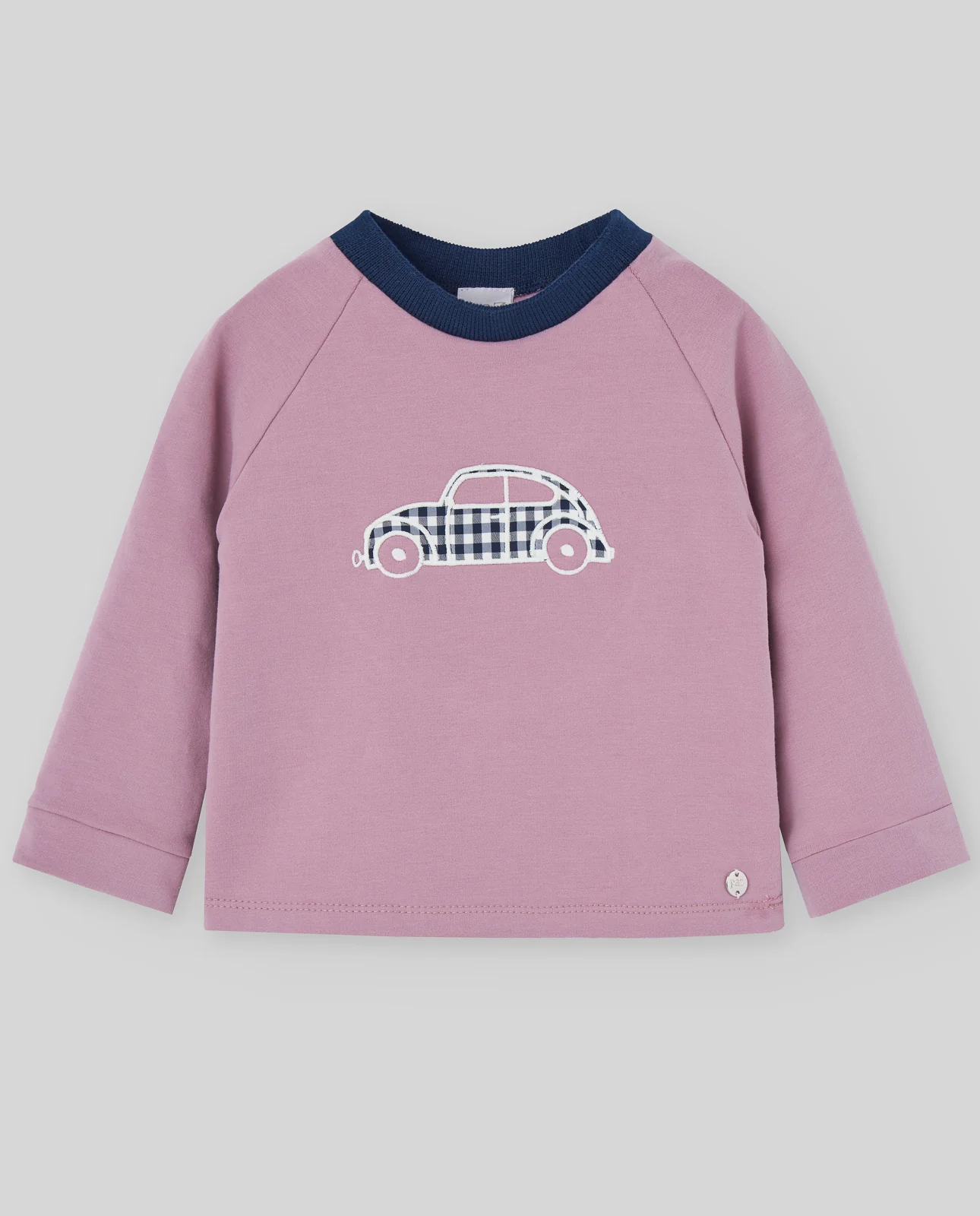Sudadera lisa con bordado central de coche y cuello redondo en contraste.