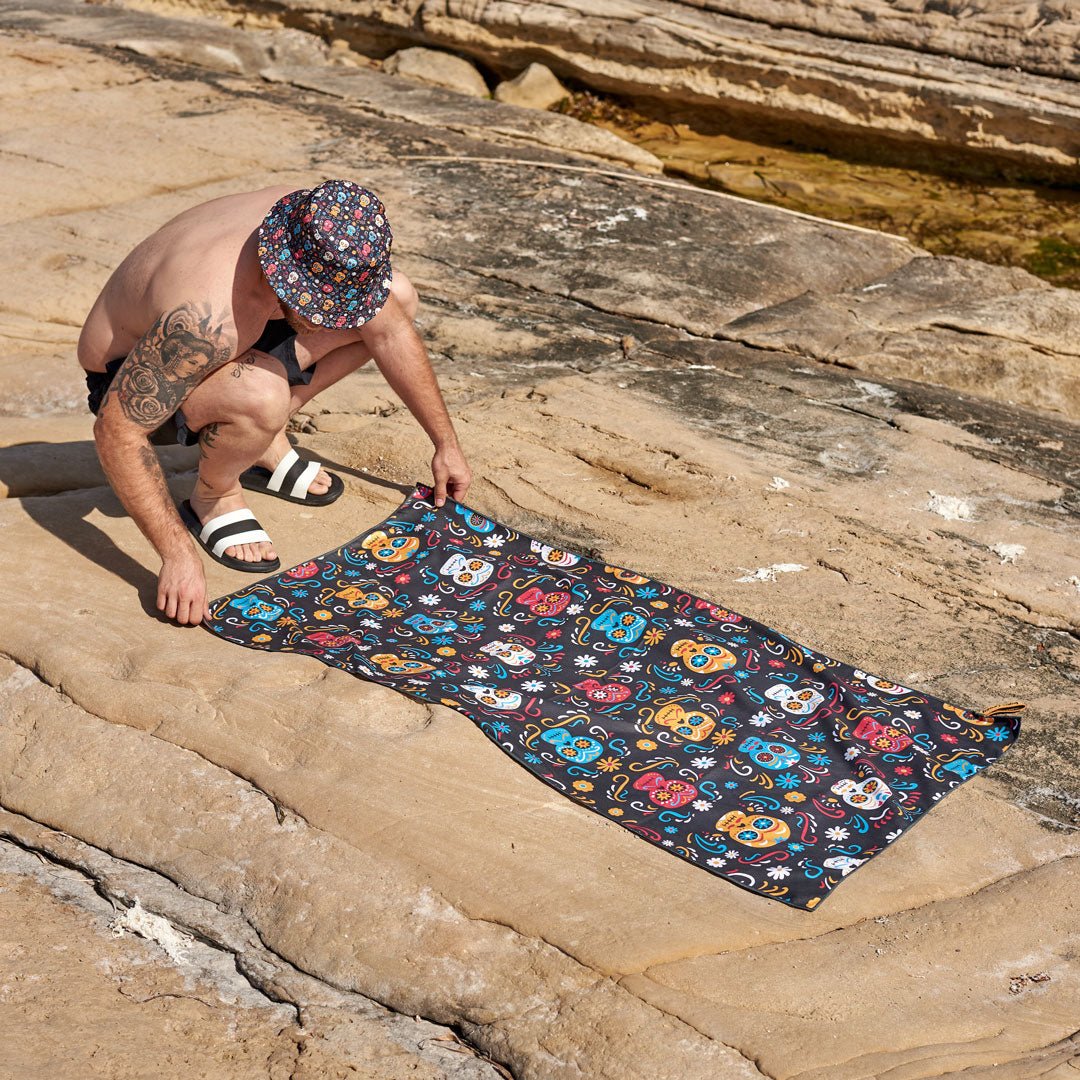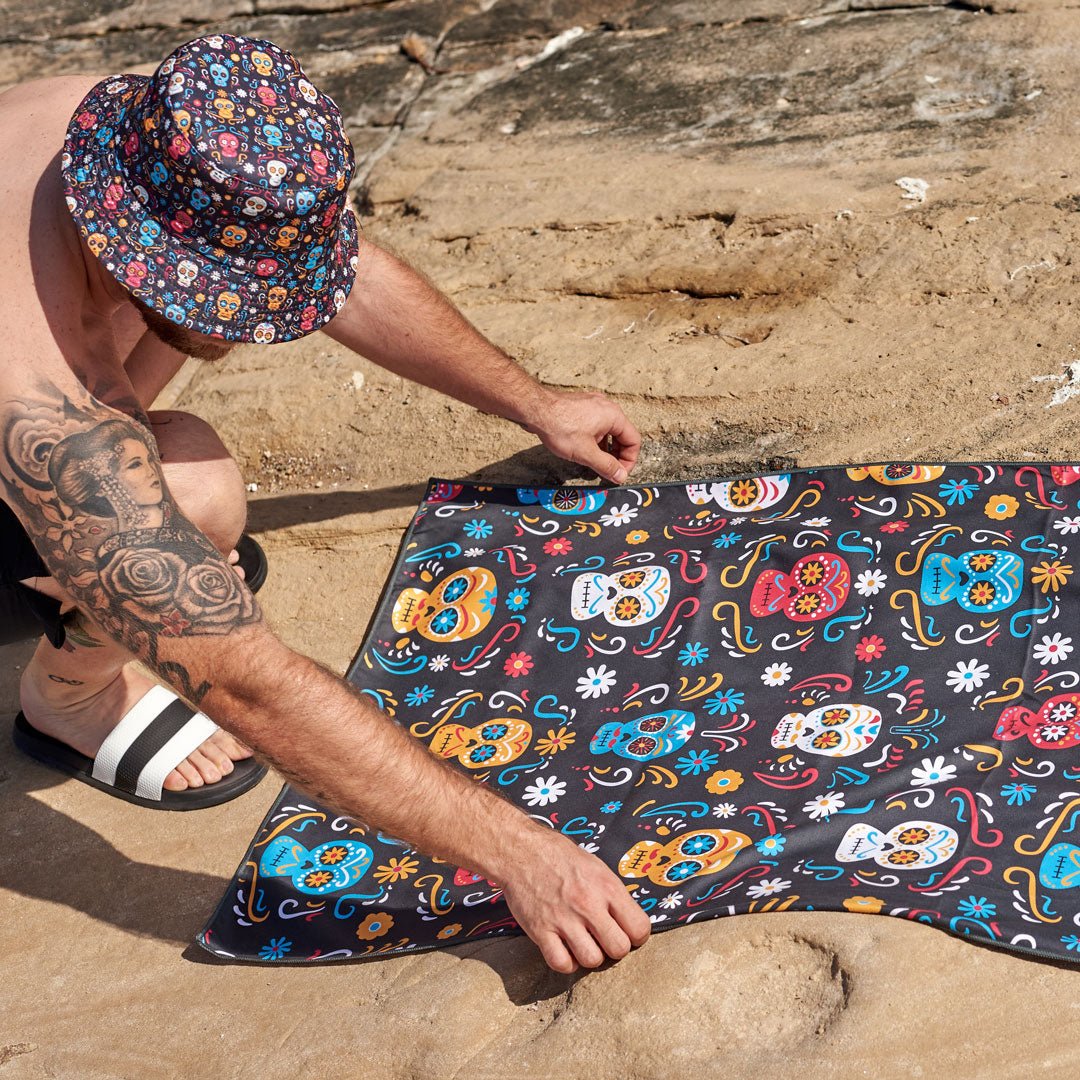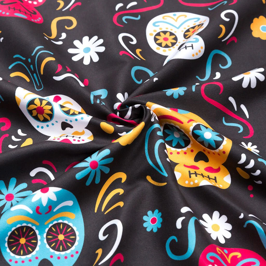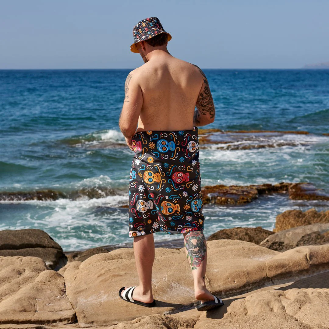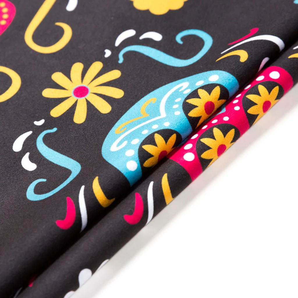 Toalla FITNESS con fantasía de CATRINAS, de color negro y multicolor, confeccionado en microfibra de secado rápido, muy ligera y absorbente. Ocupa muy poco espacio y tiene un tacto muy suave. Ideal para el hogar o para el gimnasio. ❕❕ 😎😎😎 ❗❗❗