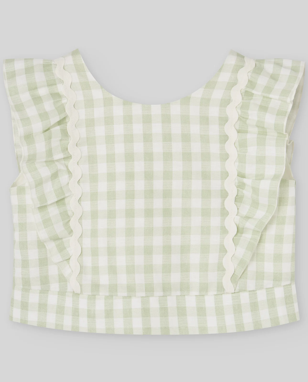 Top infantil de cuadros vichy con volantes en los hombros y detalles ondulados decorativos, parte de la colección «Frescura».