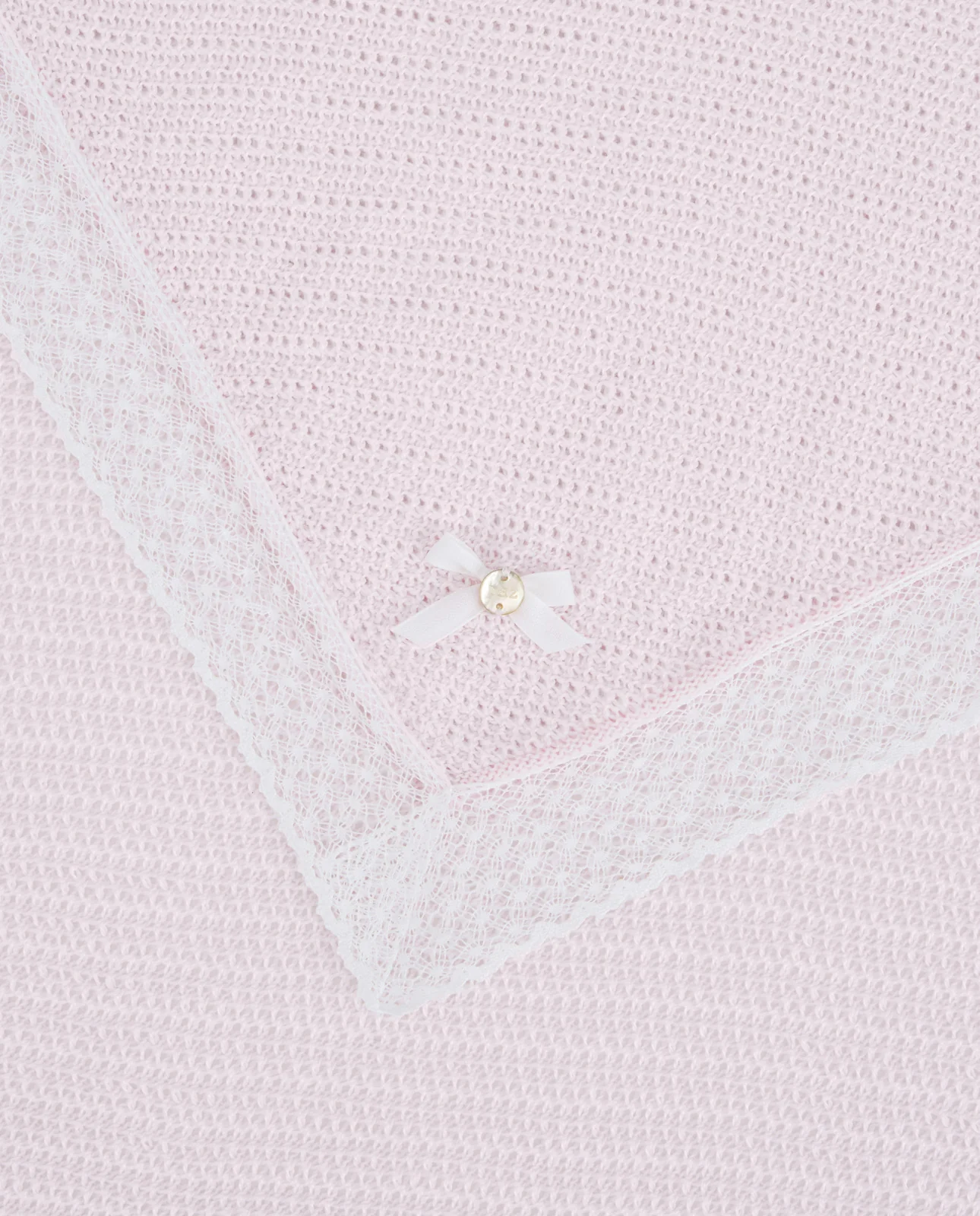 Toquilla de punto para bebé, confeccionada en algodón con diseño bicolor y lazo decorativo. Su textura suave y delicada la convierte en una pieza ideal para envolver al recién nacido o acompañar conjuntos de ceremonia. Perfecta para regalar o para los primeros días del bebé.