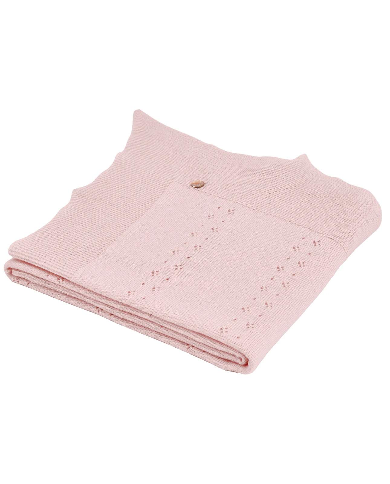 Toquilla de punto fino para bebé, con diseño calado y detalle decorativo metálico. De textura delicada y acabados cuidados, es ideal para envolver al bebé con elegancia, perfecta para ceremonias o para el uso diario.
