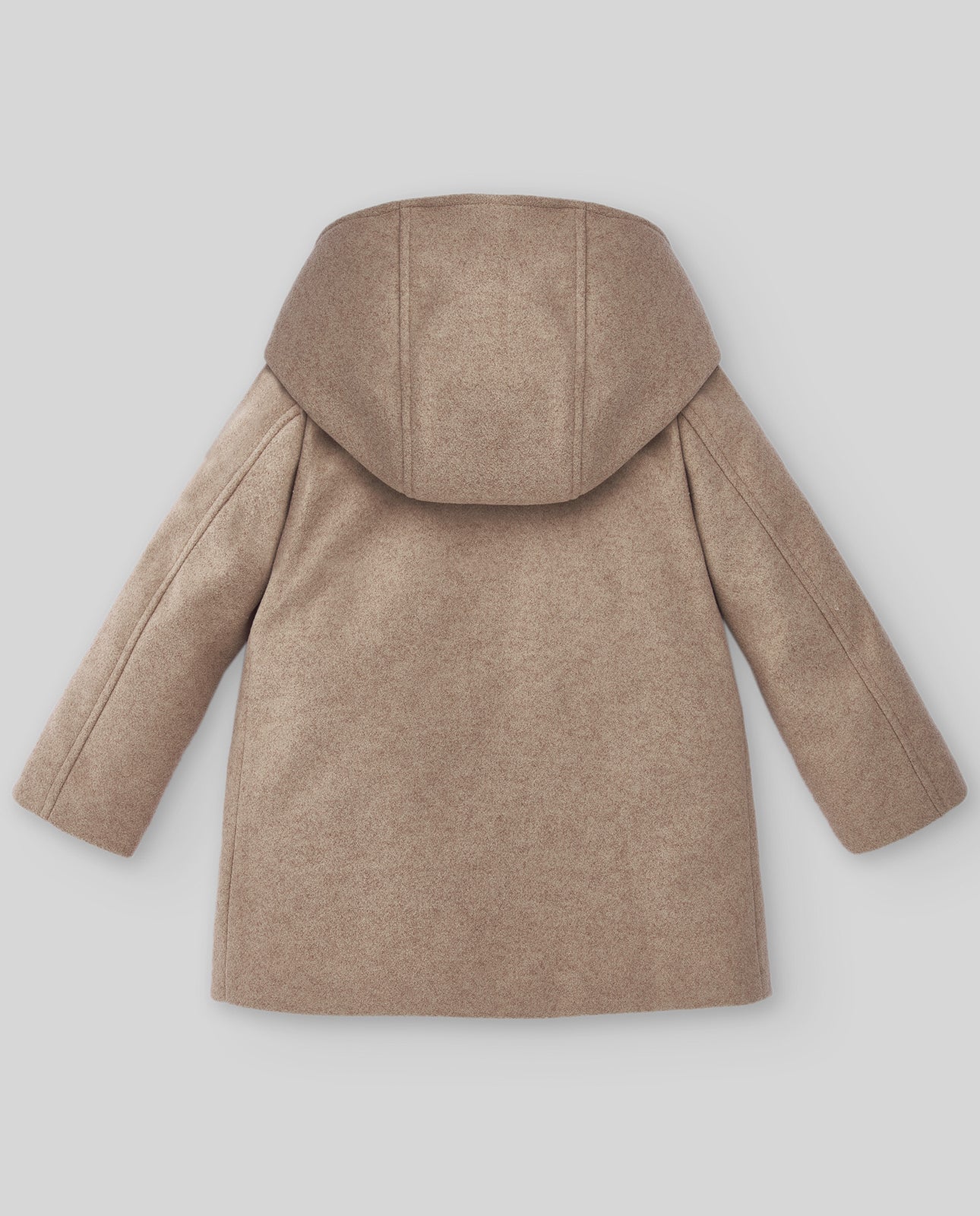 Trenka infantil de paño, con capucha desmontable y cierre con piezas tipo trenca, acabado con chapa decorativa de nácar en el bajo.