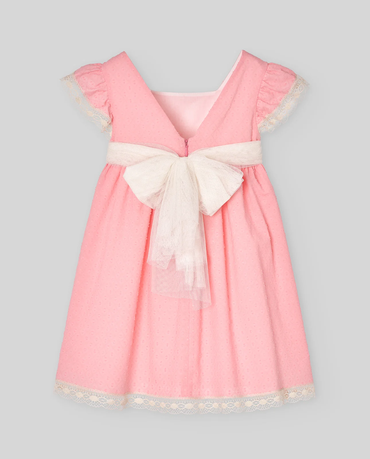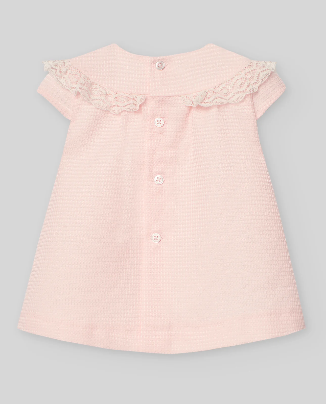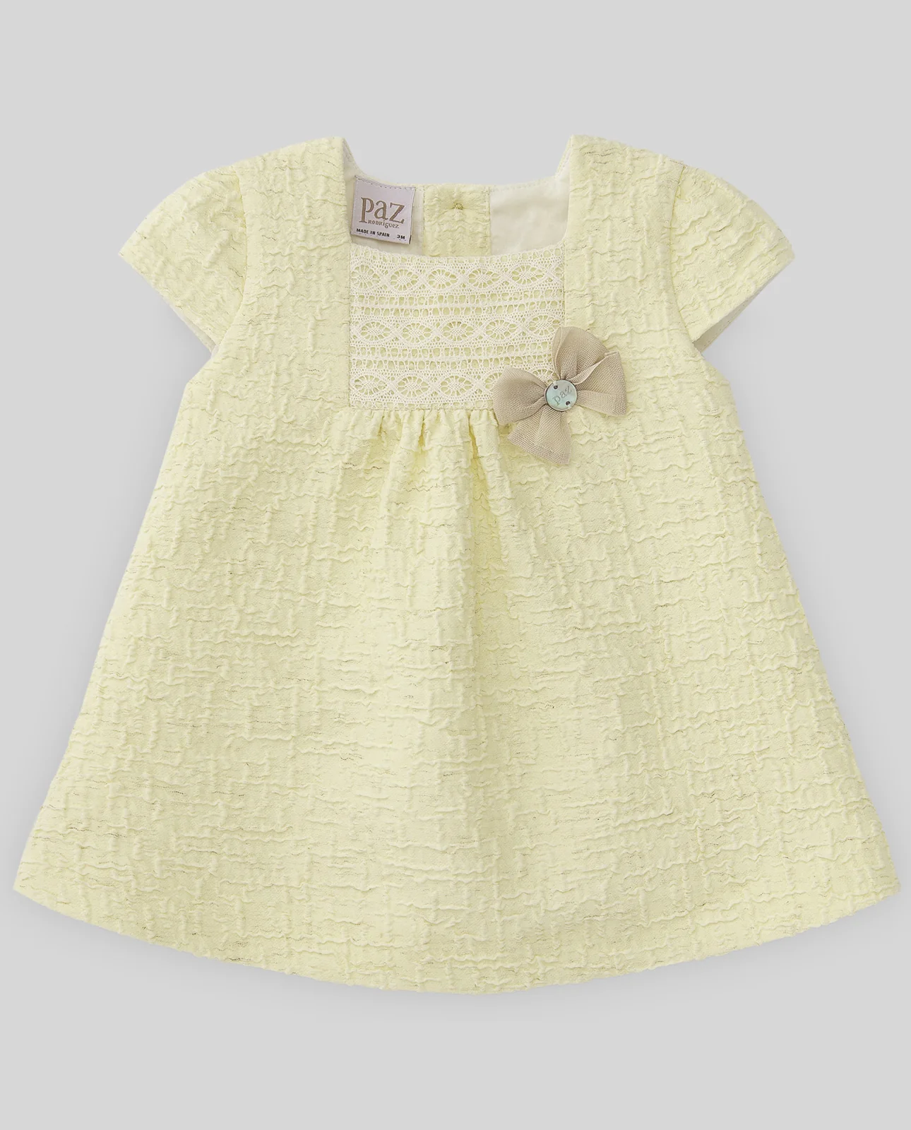 Vestido para bebé niña en manga corta y escote cuadrado. Detalle de puntilla y lazo en el delantero. Tejido con textura.