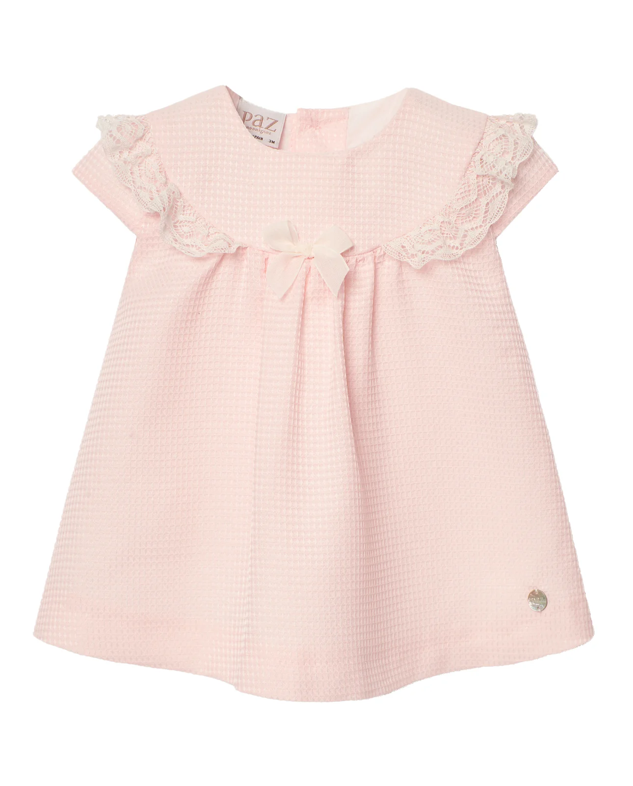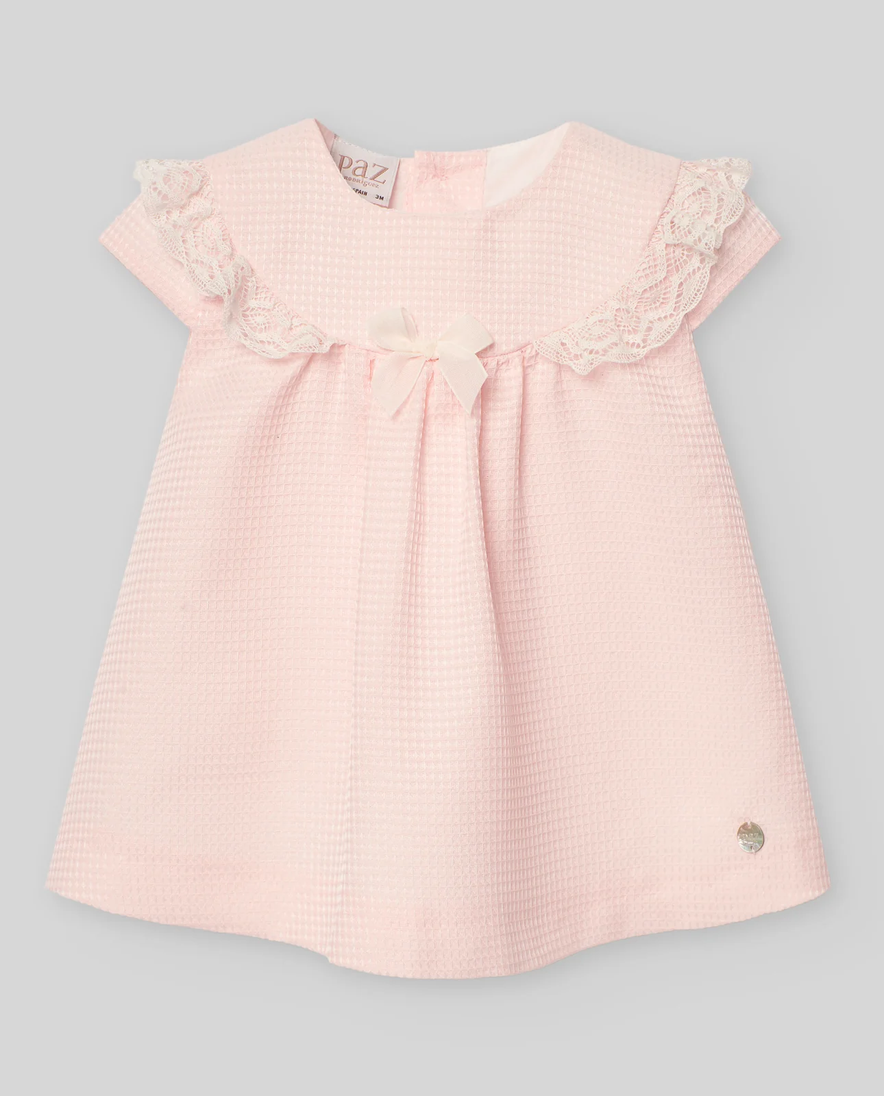 Vestido en piqué con relieve y canesú redondo enmarcado con puntillas.