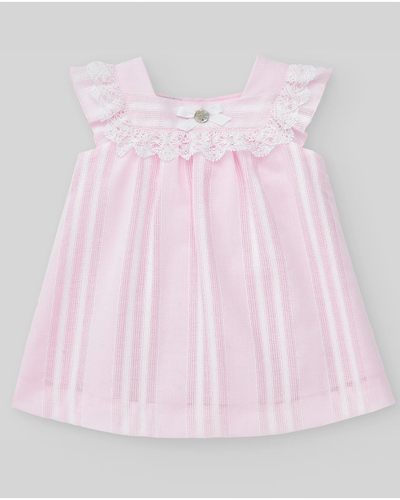 Vestido sin mangas para bebé niña, con escote cuadrado. Detalle de puntillas, tejido con bordados y listas. Lacito a tono con placa de nácar PAAZ Rodríguez. Cierre trasero con botones a tono.