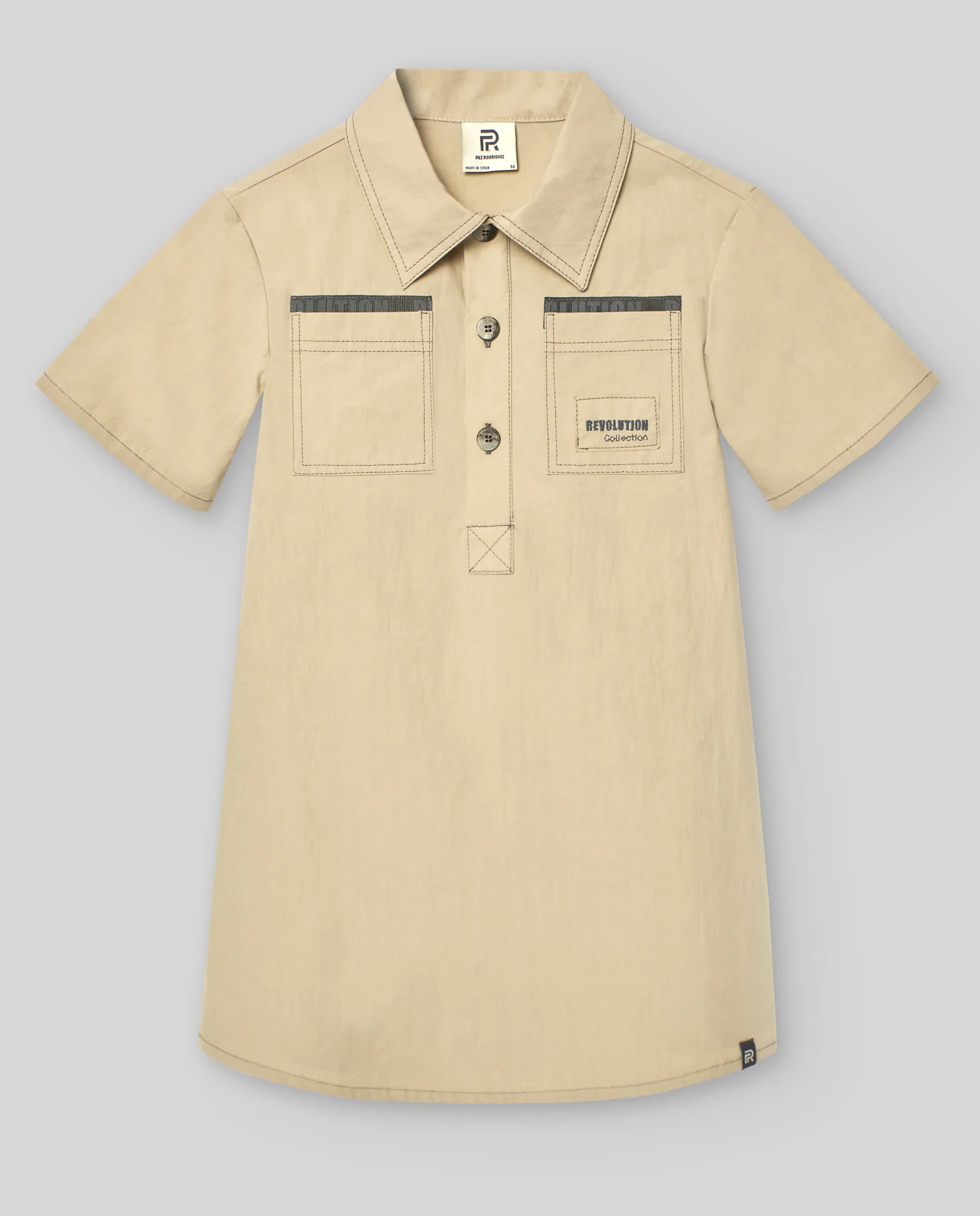 Vestido camisero en tejido técnico con abertura delantera con botones hasta cintura. Manga corta y bolsillos a la altura del pecho.
