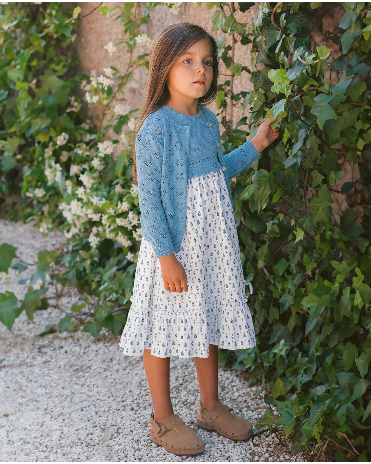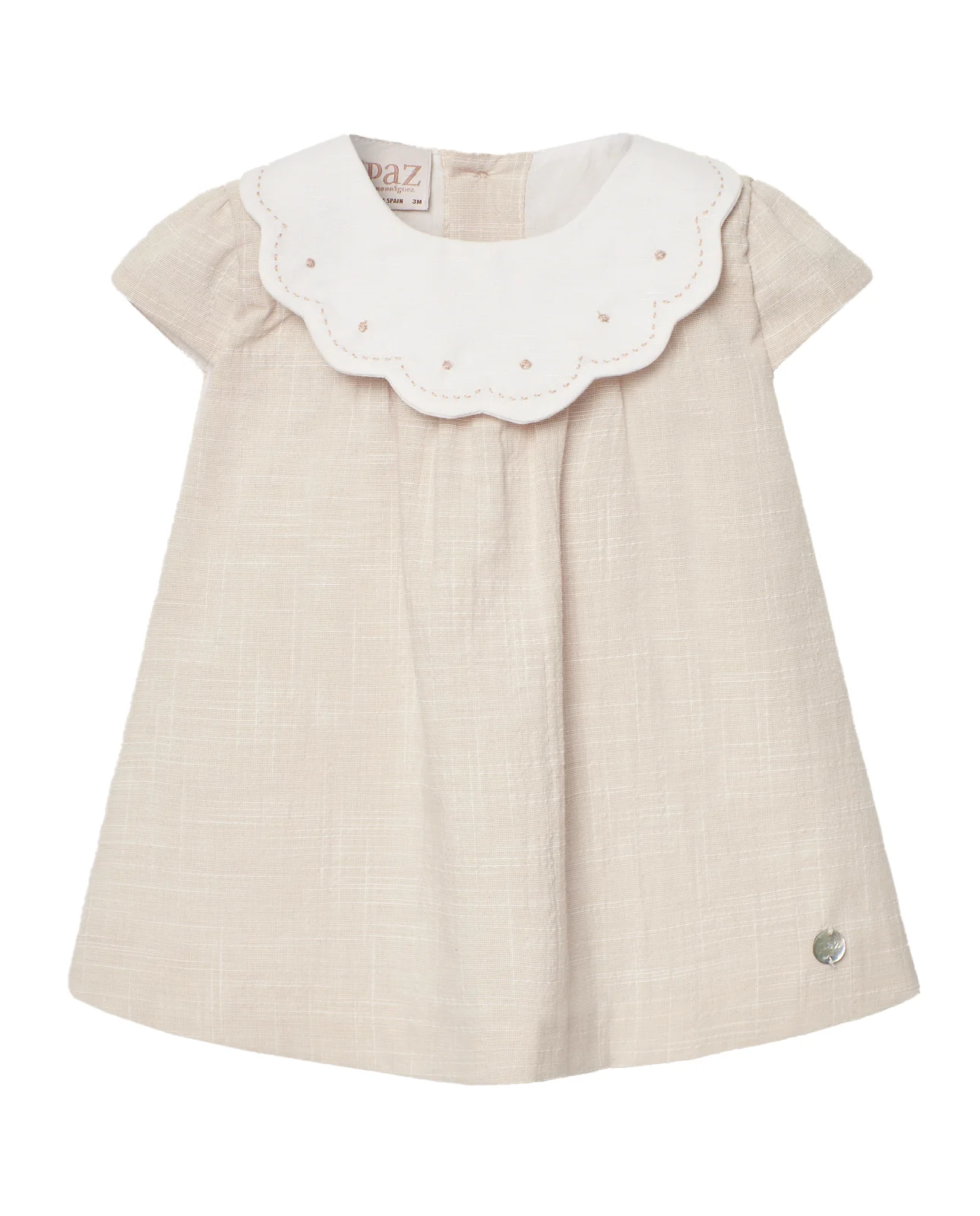 Vestido evasé en tejido textura rústica con canesú tipo babero a contraste bordado.